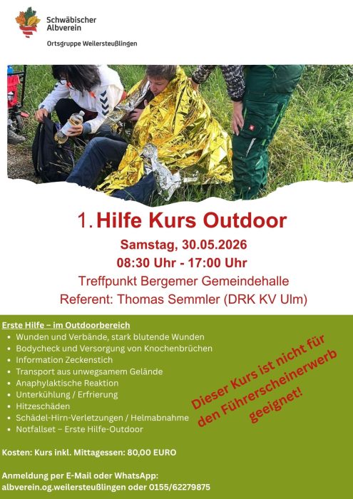 1. Hilfe Kurs Outdoor Sa., 30.05.2026, Link OG Weilersteußlingen Uhrzeit: 08:30 - 17:00 iCalendar Mit dem Laden der Karte akzeptieren Sie die Datenschutzerklärung von Google.Mehr erfahren Karte laden Google Maps immer entsperren zur Übersicht