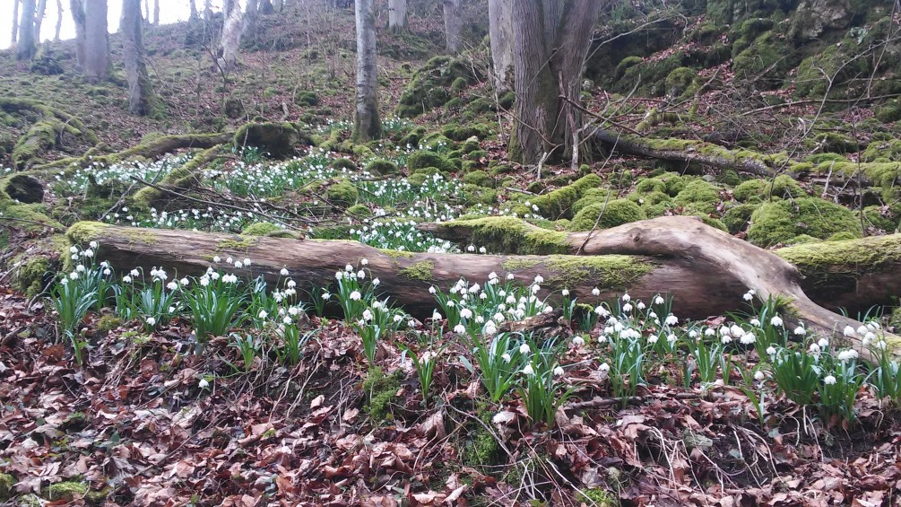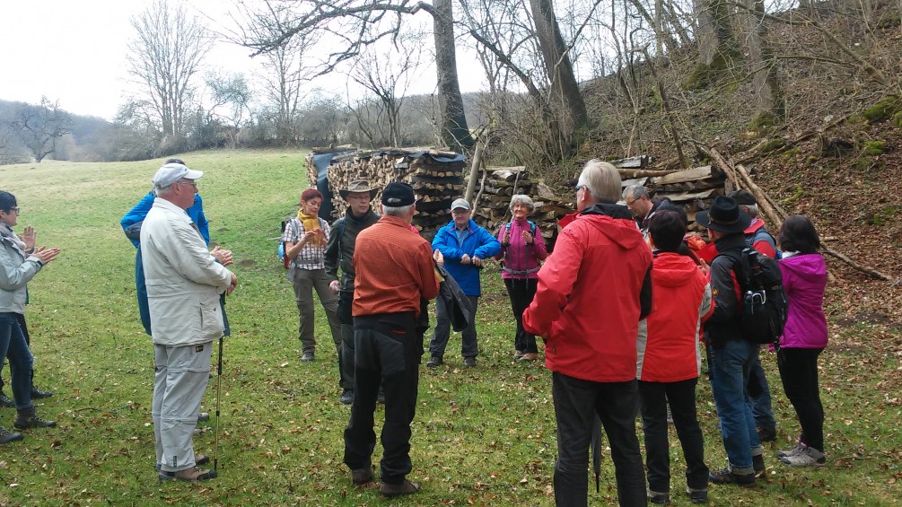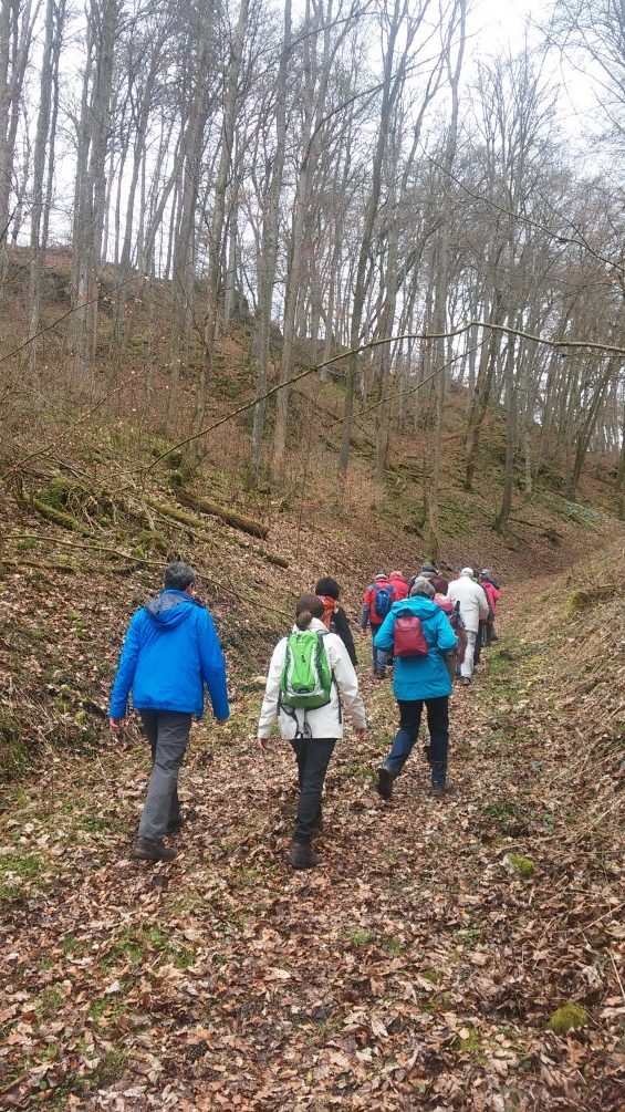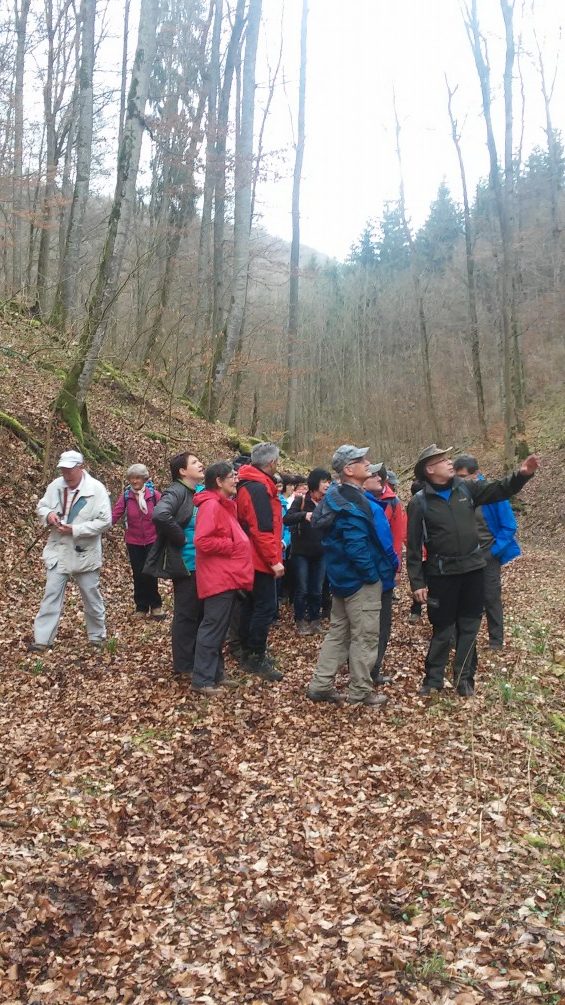 auf in die Natur. 28 Wanderfreunde machten sich am Sonntag, den 19. März auf den Weg die ersten Frühlingsboten zu bestaunen. Ab Wimsen, entlang der Ach ging es durch  ein Trockental stetig bergan in Richtung Gauingen. Wasseramseln, Märzenbecher und Huflattich begegneten uns am Wegesrand. Querfeldein weiter bergauf durch Buchen und Mischwälder erreichte man die Albhochfläche im Norden von Huldstetten. Auf für alle unbekannten Wege unter dem Motto „hier war ich auch noch nie“ führte der Weg weiter. Einige Ausblicke in die Alblandschaft gaben dann doch wieder Orientierungshilfe. Über das Gewann Bahnholz erreichte man schließlich die ersten Wiesen oberhalb Schloß Ehrenfels ( Brand ). Hier lagen mächtige gefällte Fichten deren Alter geschätzt werden konnte. Die Antworten waren 90 bis 230 Jahre. Das tatsächliche Alter 130 Jahre. Nach zweieinhalb Stunden erreichte man den Ausgangspunkt Wimsen wieder. Bei Kaffee und Kuchen im grünen Baum in Gauingen ließ man den schönen Nachmittag zu Ende gehen.