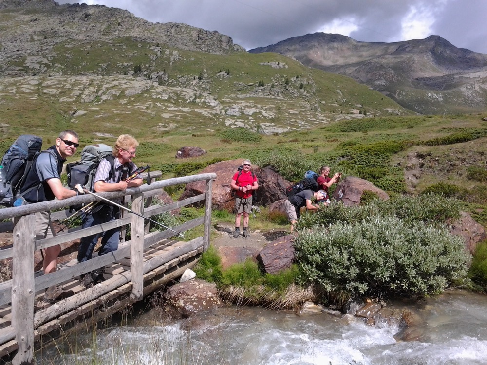 Eine besondere Herausforderung war nach fast 4900 Anstiegsmetern an vier Tagen aber der letzte Tag: Gewitter, Dauerregen und Temperaturrückgang machten den Rückweg vom Ultner Grünsee ins Martelltal über Zufrittjoch oder Soyscharte unmöglich. Dies bescherte leider keine weiteren Höhenerlebnisse, dafür einen Schnellabstieg zum Weißbrunnsee und eine Bus-Bus-Zug-Busfahrt über Meran bis zum Parkplatz Enzianhütte im Martelltal zurück. Das klappte gut und es war interessant, mit der Vinschgauer Bahn an der Etsch aufwärts zu fahren.