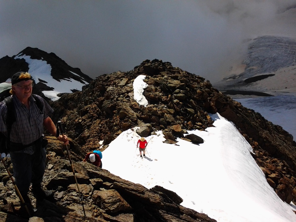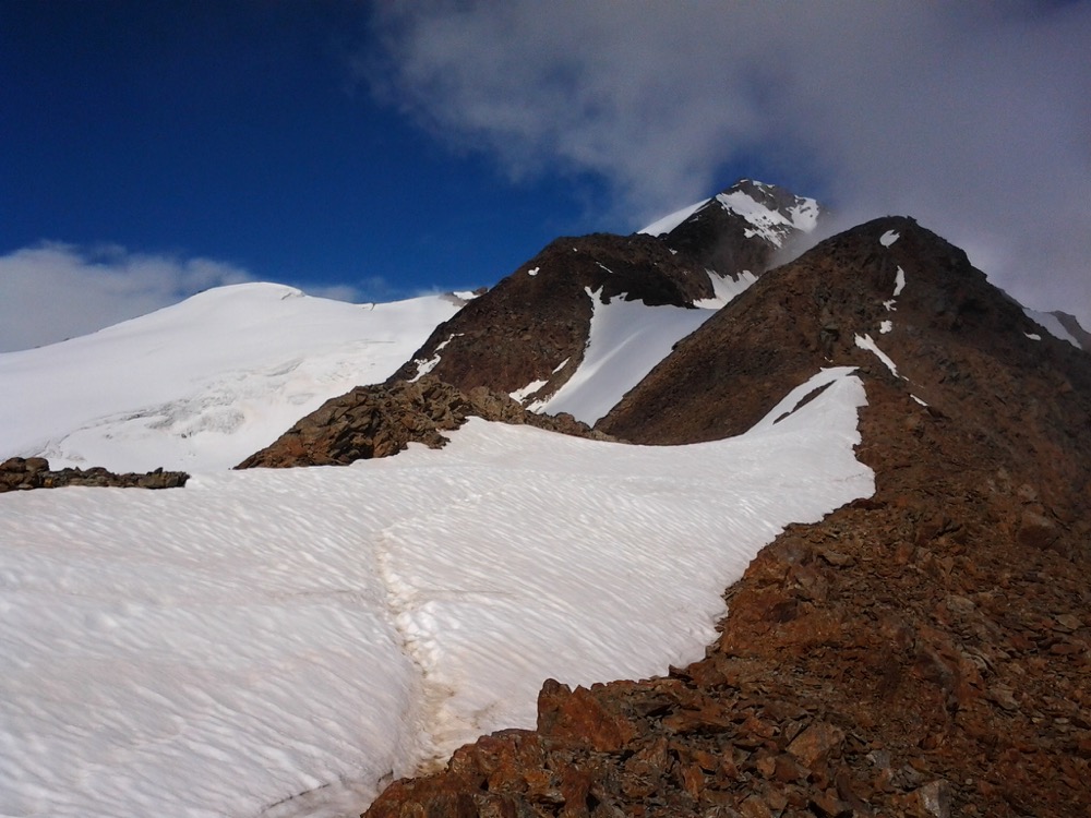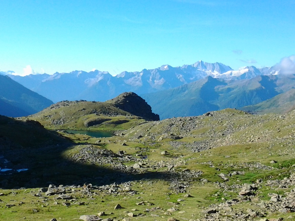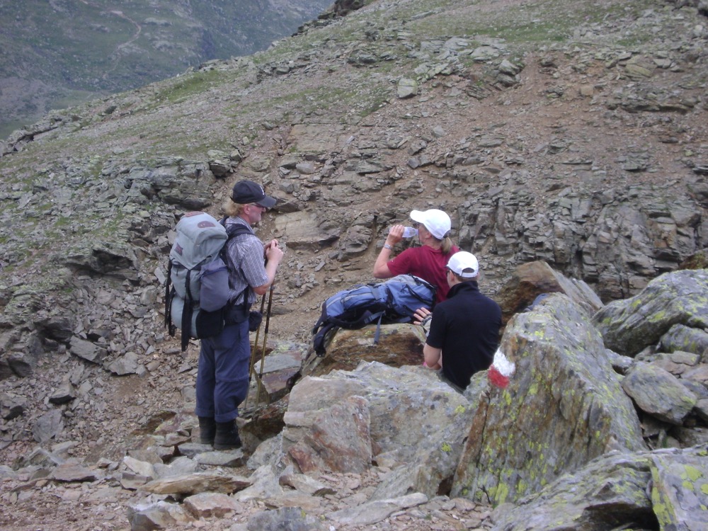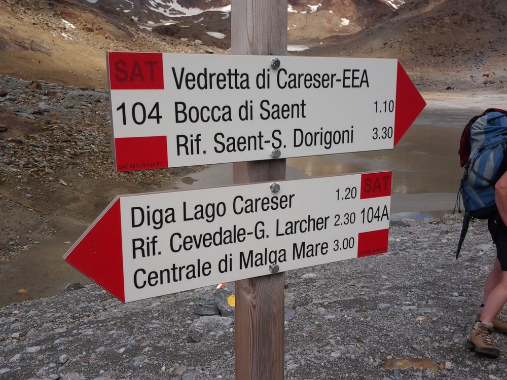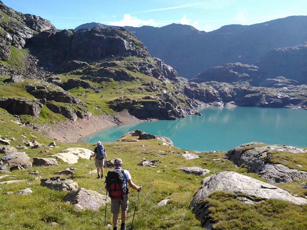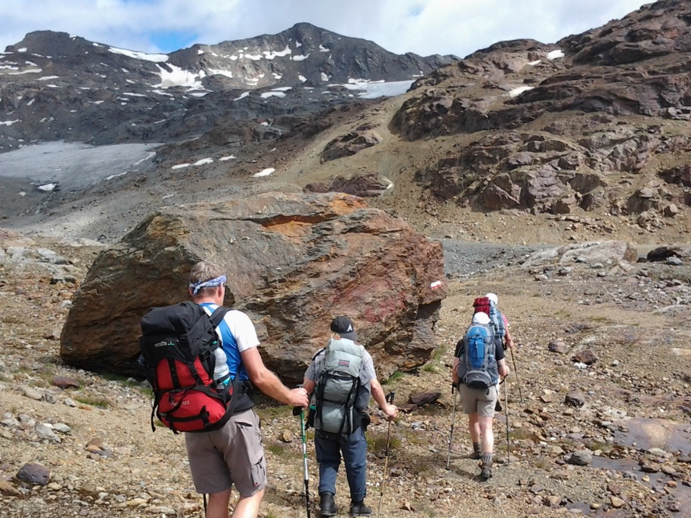 Zwischen den Südtiroler und Trentiner Alpenvereinshütten ging es 2016 etwas höher hinaus als sonst. Auf den langen Tagesetappen war zweifellos der Höhepunkt die Besteigung der Zufallspitze (3757 m) der Cevedalegruppe. Außerdem konnte man die Cima Mezzena (3172 m) über der Bocca di Sáent und im äußersten Südosten der Gruppe den Aussichtsberg Gleck (2957 m) besteigen. Schon durch die Höhenlage waren Schneefelder/Gletscher und Blockwerk über die Jöcher zwischen 2800 und 3000 m angesagt. Viele Seen, besonders um den Stausee Cáreser unter dem gleichnamigen Gletscher und um die Haselgruber-Hütte am Übergang von Val di Rabbi ins Ultental, säumten den Weg, einer schöner gelegen als der andere. Vor den Eisgipfeln der Cevedalegruppe vom Monte Vióz bis zum Monte Cevedale und zur Zufallspitze (Cima Cevedale) war dies ein besonderer Genuss. Einzig König Ortler hüllte sich immer in Wolken oder war hinter den anderen Granden versteckt; nur bei der Anfahrt vom Reschen die Malser Halde hinunter konnte man ihn wie gewohnt bewundern.