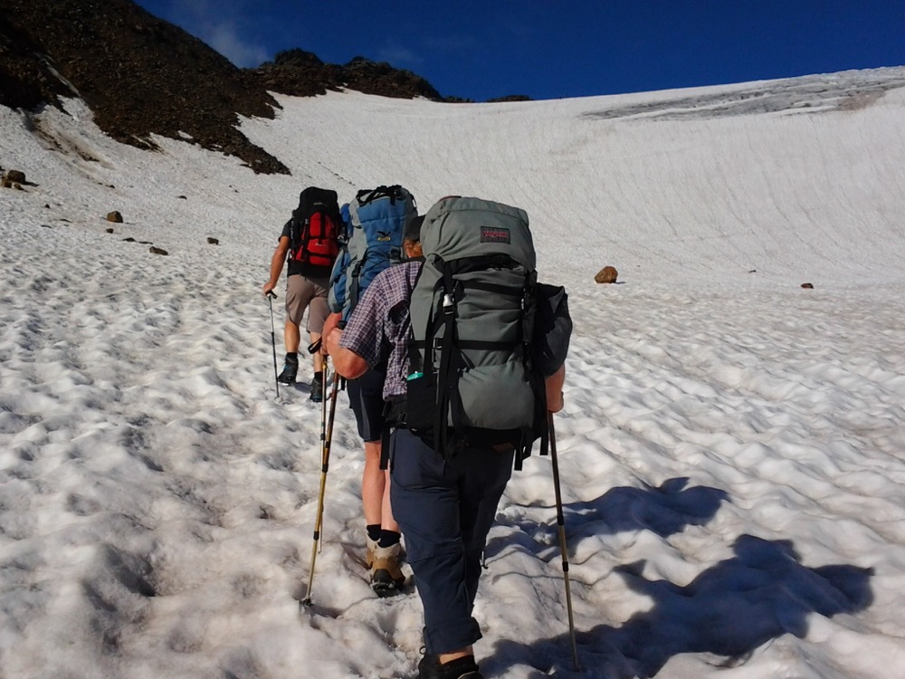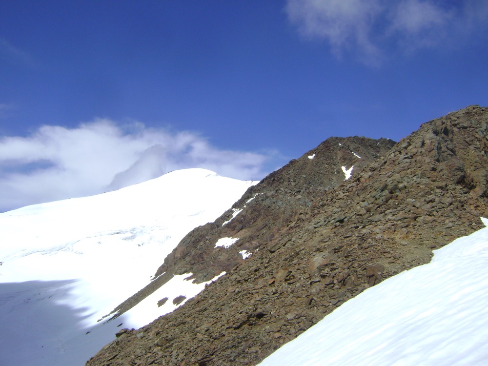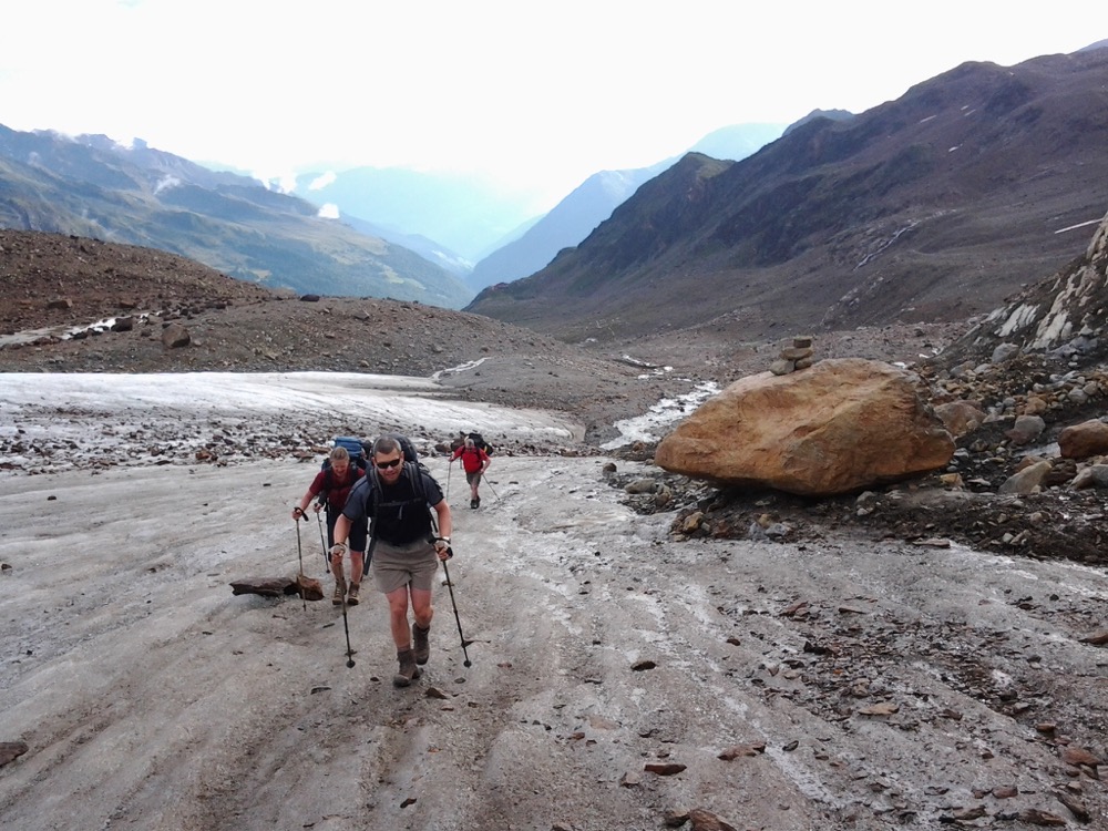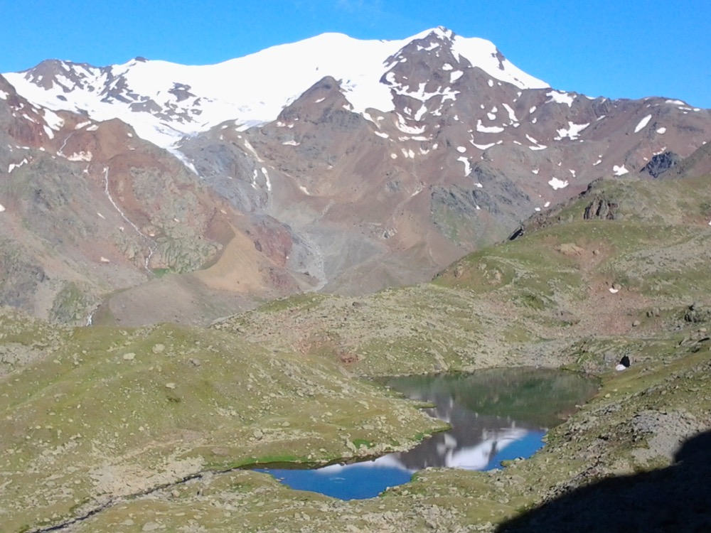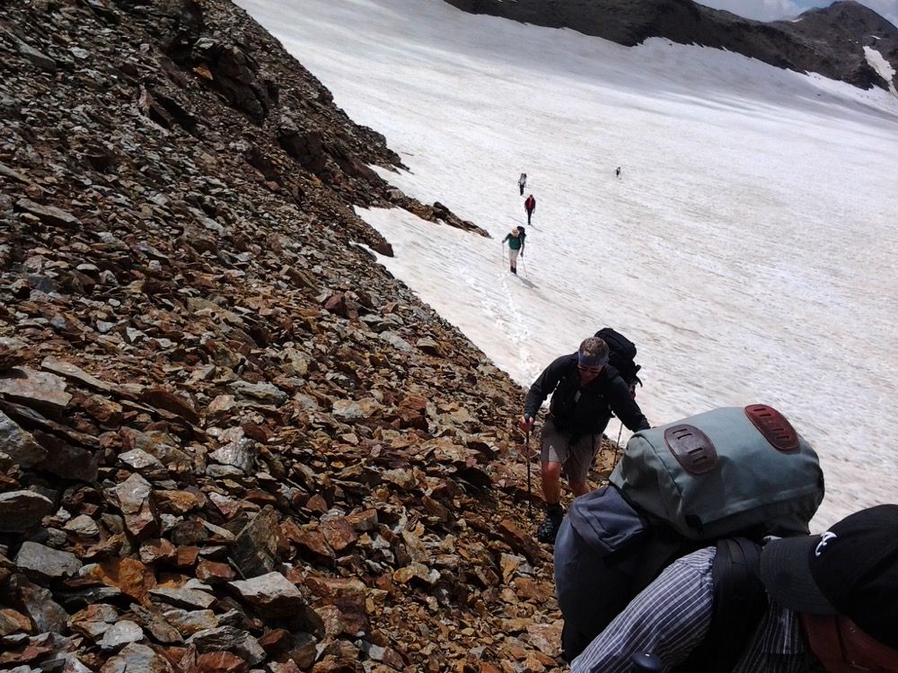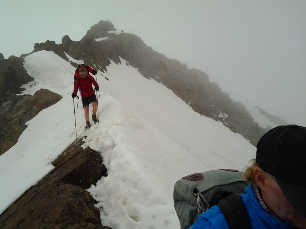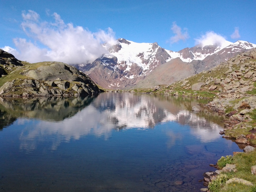Zwischen den Südtiroler und Trentiner Alpenvereinshütten ging es 2016 etwas höher hinaus als sonst. Auf den langen Tagesetappen war zweifellos der Höhepunkt die Besteigung der Zufallspitze (3757 m) der Cevedalegruppe. Außerdem konnte man die Cima Mezzena (3172 m) über der Bocca di Sáent und im äußersten Südosten der Gruppe den Aussichtsberg Gleck (2957 m) besteigen. Schon durch die Höhenlage waren Schneefelder/Gletscher und Blockwerk über die Jöcher zwischen 2800 und 3000 m angesagt. Viele Seen, besonders um den Stausee Cáreser unter dem gleichnamigen Gletscher und um die Haselgruber-Hütte am Übergang von Val di Rabbi ins Ultental, säumten den Weg, einer schöner gelegen als der andere. Vor den Eisgipfeln der Cevedalegruppe vom Monte Vióz bis zum Monte Cevedale und zur Zufallspitze (Cima Cevedale) war dies ein besonderer Genuss. Einzig König Ortler hüllte sich immer in Wolken oder war hinter den anderen Granden versteckt; nur bei der Anfahrt vom Reschen die Malser Halde hinunter konnte man ihn wie gewohnt bewundern.