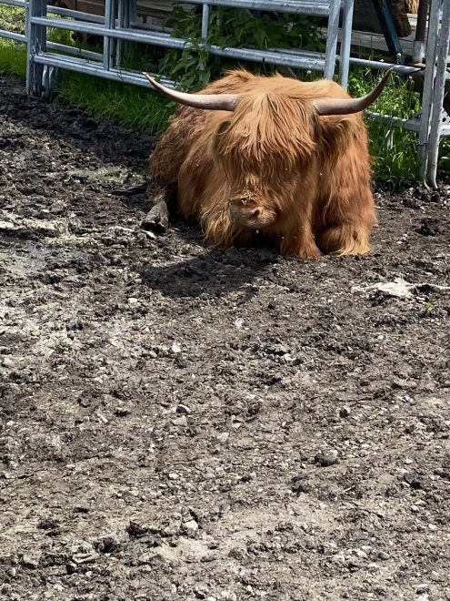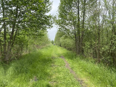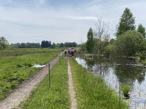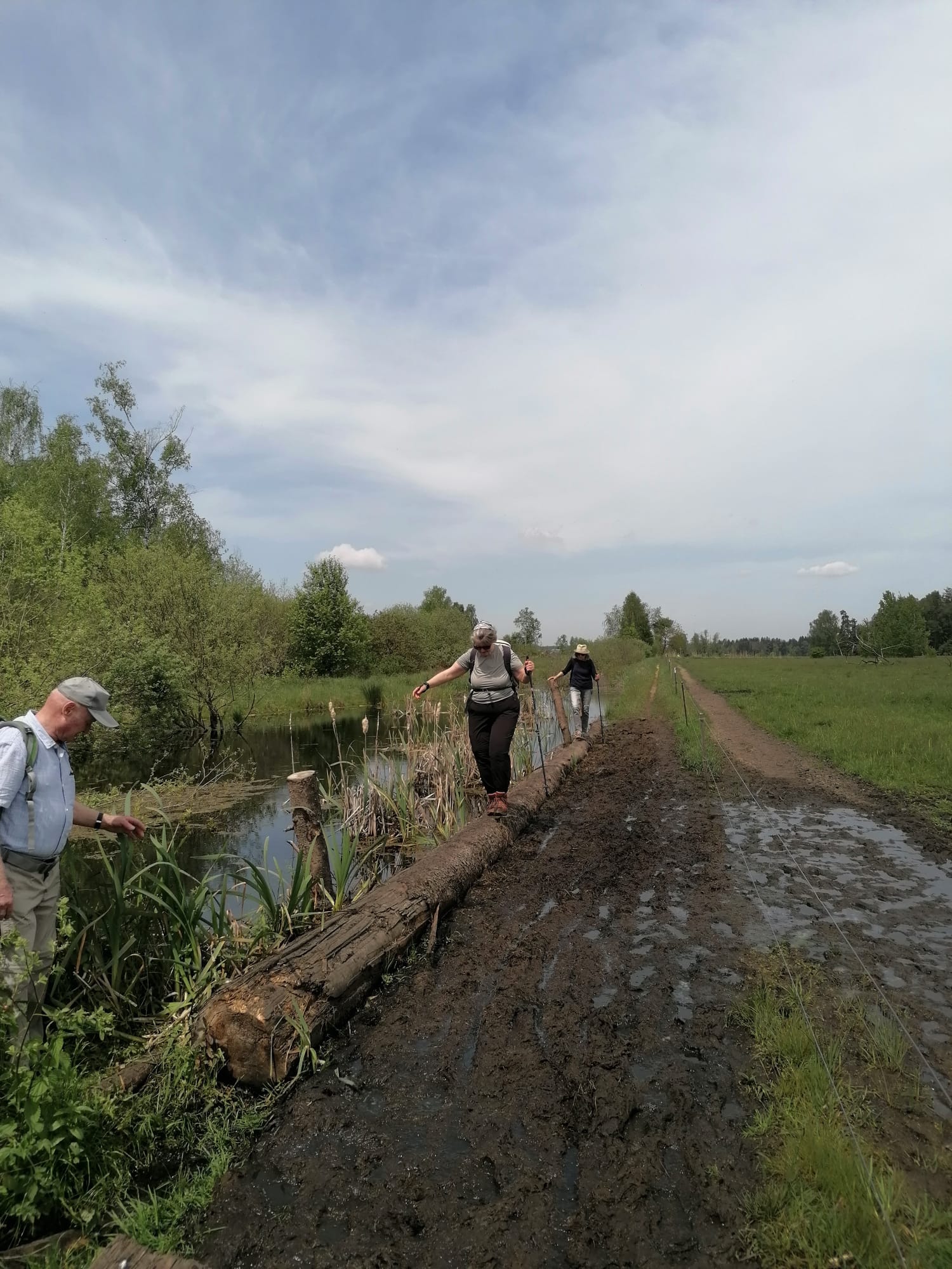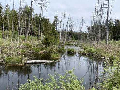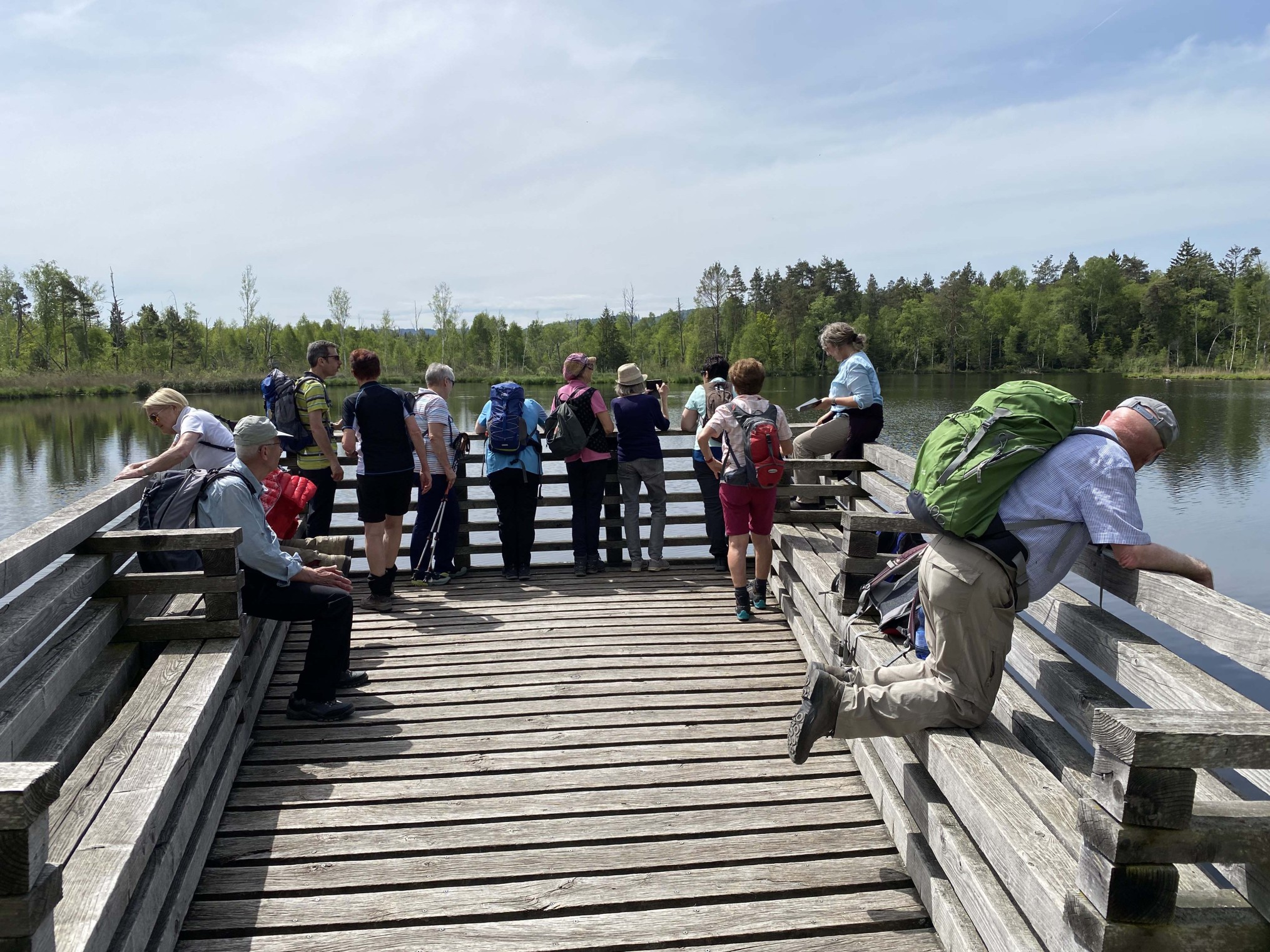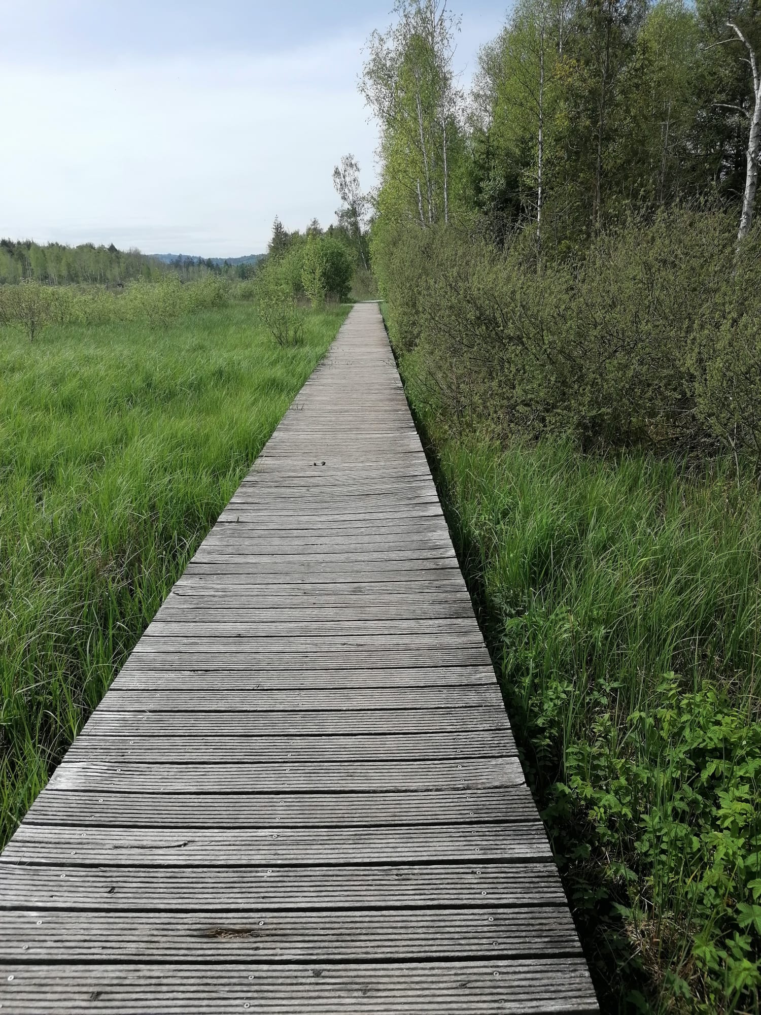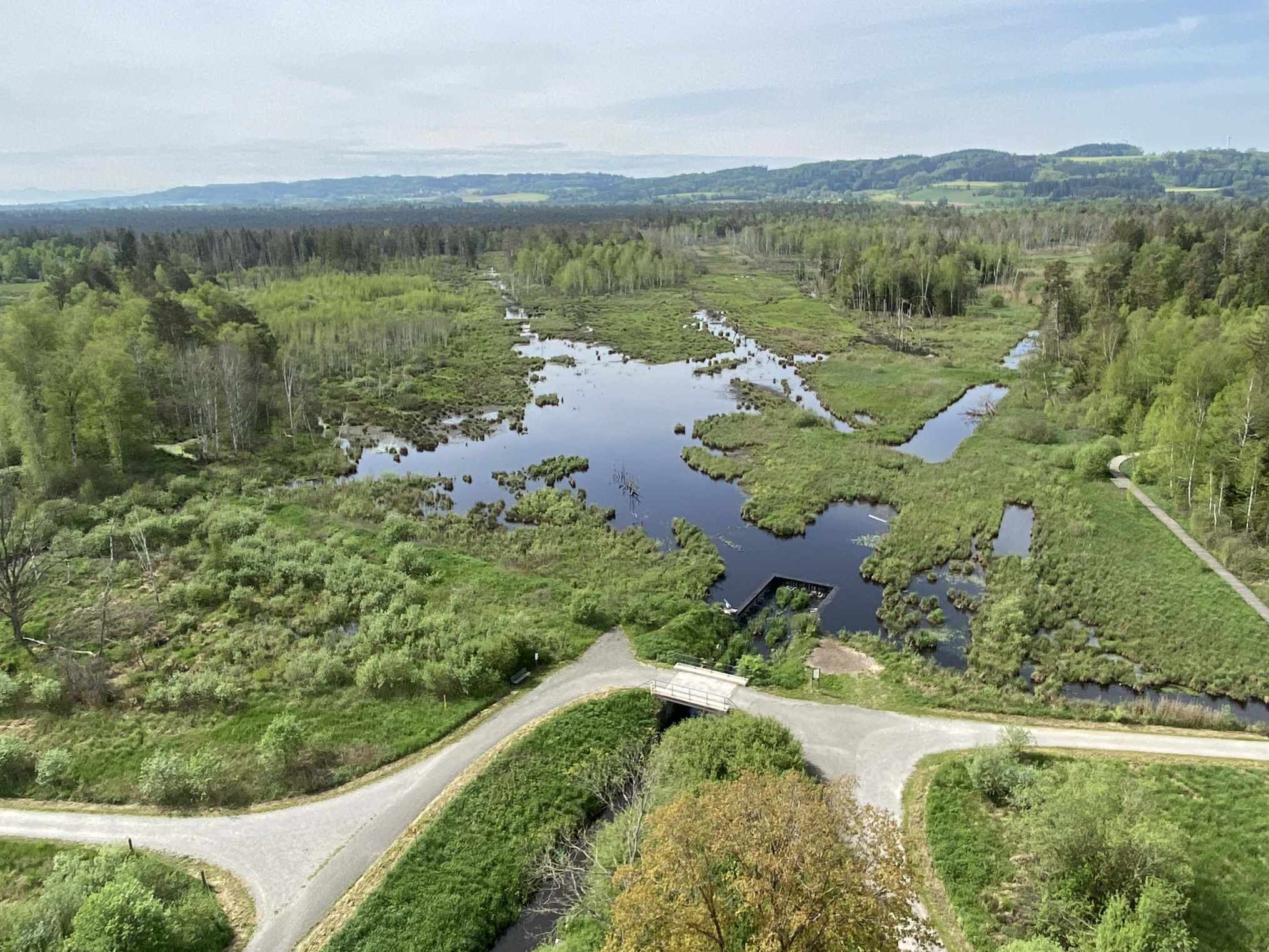 An diesem ersten richtigen Sommertag wollen wir nicht nur eine herrliche Tortenauswahl genießen, sondern eine ganz andere Landschaft kennen lernen.Deshalb verlassen wir unser hügeliges Land und landen in einer ganz anderen Welt. Man kann dieses flache Land erst einmal mit den Ohren erwandern, staunt über ungewohnte Vogelstimmen* und freut sich am tiefen, gurgelnden Quaken der Frösche, das uns den ganzen Weg begleitet. Wann haben wir zum letzten Mal beim Ruf eines Kuckucks unseren Geldbeutel schütteln können? Unser Geldbeutel schaukelt hinten im Rucksack und so sorgen wir vielleicht beim Kuckucksruf im Laufen für einen Inflationsausgleich. Von einem 33 m hohen Aussichtsturm überblicken wir das Moor und sehen die wuscheligen Rücken der Highland Rinder und Galloways auf saftigen, grünen Wiesen und dazwischen die dunklen Moorseen und Bäche. In der Ferne rechts vom Heiligenberg erkennt man schwach wie ein Trugbild die Schweizer Alpen. Es duftet es nach Sommer und nach feuchter Erde. Den Birken tut der Boden gut. Das sieht man an ihrer glänzend weißen Rinde. Aber manchen Birken ist es einfach zu viel Fußbad. Sie können ja nicht aussteigen und deshalb fallen einfach um oder sterben ab, weil ihre Wurzeln ertrinken. Wer hat Lust in die Moorseen zu Welsen, Karpfen und Schwänen zu steigen? Jetzt ist es doch richtig heiß. Niemand. Wir genießen das Schauspiel vom Ufer aus, denn wir würden hier eine faszinierende Welt stören. Wir bleiben auf den schwarzen, federnden Wegen, hüpfen durch Matsch, balancieren über nasse Balken und ehe wir mit dem Fuß ganz ins Wasser rutschen gibt es hier und da eine Hand, die uns hält.