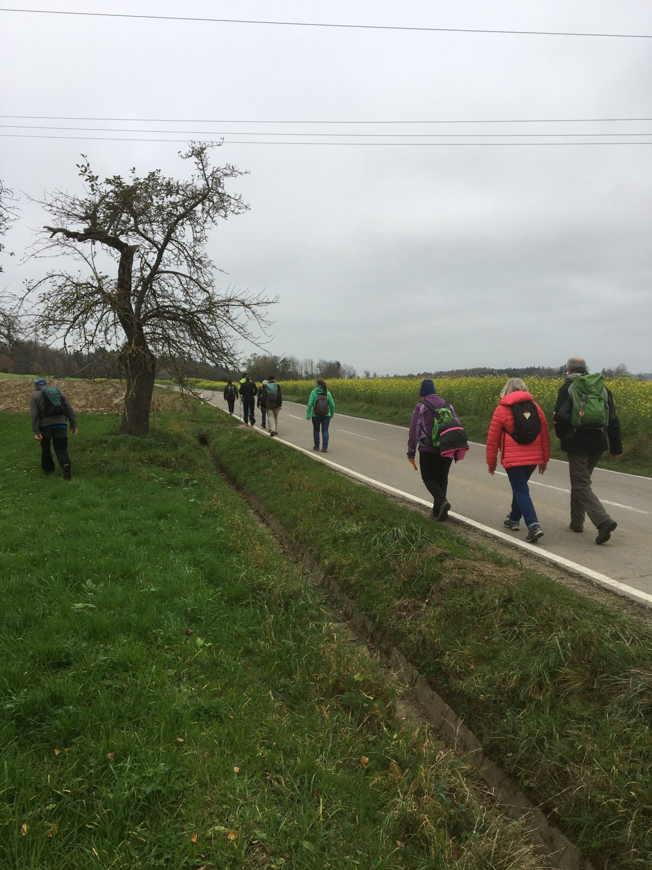 Wir blieben jedoch in Oberschwaben und wanderten ab Bad Schussenried über die eiszeitliche Endmoräne durch viel Laub auf die Atzenberger Höhe. An dem trüben, wenn auch trockenen Tag mussten wir uns die meisten Alpengipfel denken.