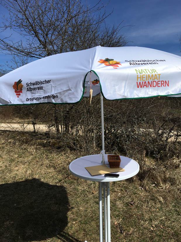 Ganz erfreulicherweise wollten neun Familien mit 40 Personen einfach mal wieder was anderes haben und meldeten sich zur 1,5-stündigen Runde auf der Hochfläche beim Hayinger Segelflugplatz an. Im 20-Minuten-Takt schickten wir die Familien mit einem großen Umschlag kontaktfrei auf die Strecke. „Hasi Oster“ freute sich im Begrüßungsbrief über ihre Teilnahme und erläuterte, dass an sechs Stationen Aufgaben und Rätsel zu lösen seien und am Ende, wenn sie je zurückfänden, für jedes Kind ein Osternest zu finden sei. Konzeption und Vorbereitung dieser Rallye und ihre Corona-Anpassung stammten von Kirsten Klahold, pädagogische Mitarbeiterin des Schwäbischen Albvereins.