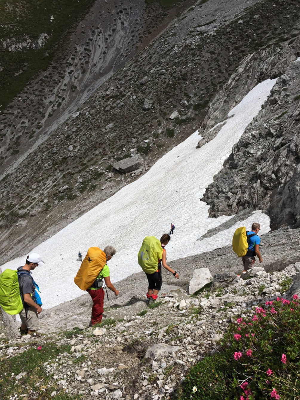 Zwischen Edelweißhaus, Leutkircher Hütte,  Simmshütte und Lechtal warteten über 5000 m Auf- und Abstieg auf die 4 Frauen und 5 Männer. Rotschrofenspitze, Holzgauer Wetterspitze und die Etappe über viele Jöcher zur Simmshütte waren die Höhepunkte der Hüttentour. Am 2. Tag verhinderten Regen und Temperatursturz den Aufstieg zum Stanskogel, ansonsten konnte man das Programm durchziehen. Dazu gehörten auch die neue Hängebrücke im Kaiserbachtal zum Auftakt sowie die gewaltige Hängebrücke am Lechweg bei Holzgau. Neugierige Murmeltierjunge sah man aus nächster Nähe wie noch nie. Die Blumenpracht ist in den Lechtalern sowieso legendär.
