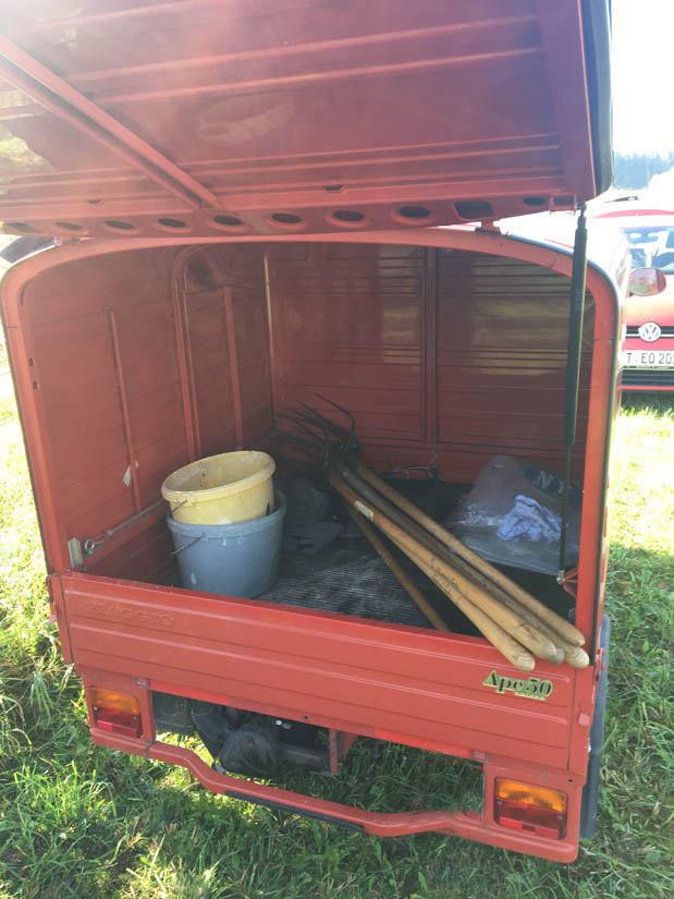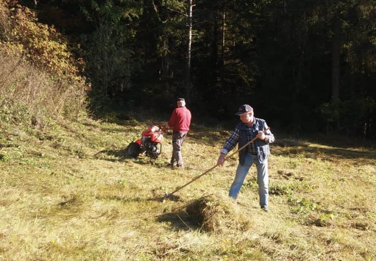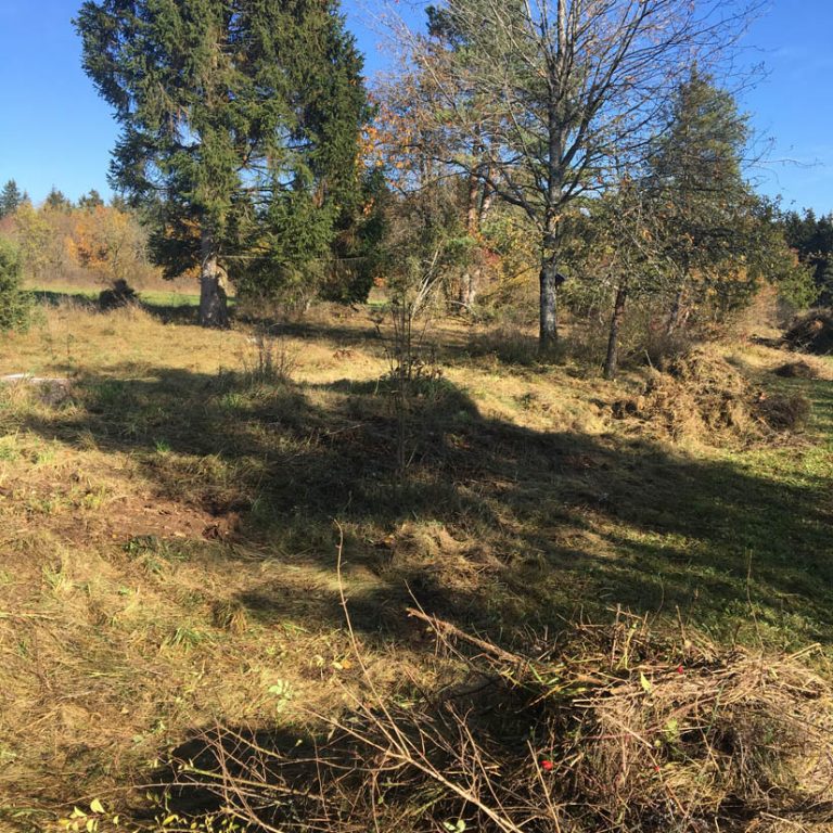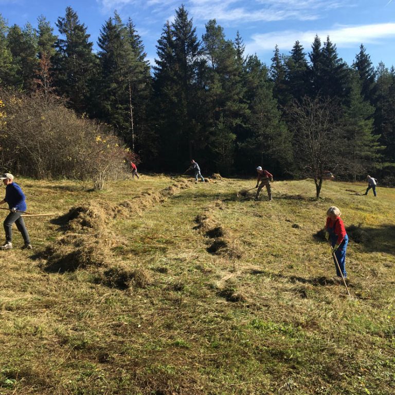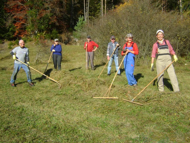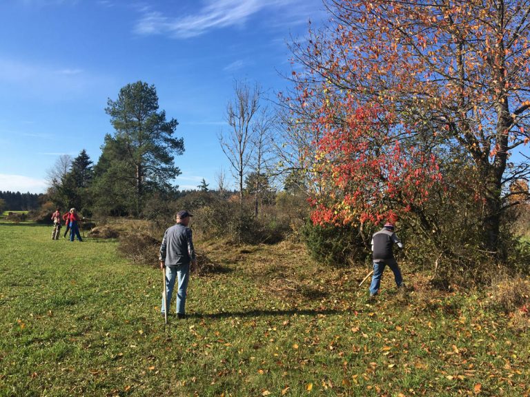 Beim Hegener Bäumle an der Straße nach Ehestetten entstand von Neuem ein offenes parkartiges Gelände, ideal für Insekten, Vögel und Kleintiere – mittendrin Bienenstöcke. Mit Heugabeln ausgerüstet wurde abgemähtes Buschwerk arbeitsintensiv entfernt.