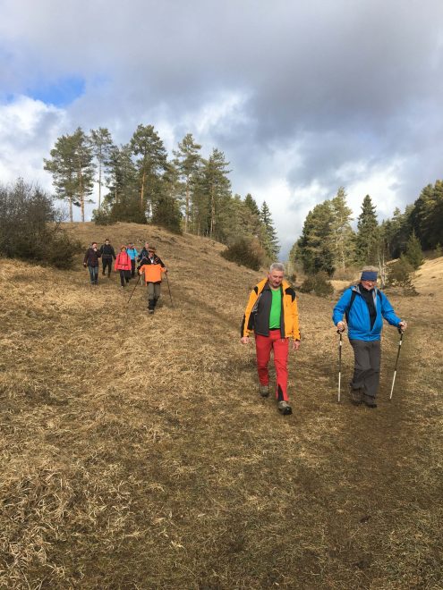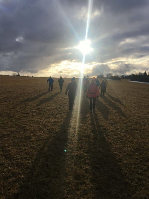 Es ging zügig über Wiesen Richtung Reisachwald, den wir Richtung Ehestetten durchquerten, wo uns auf den Höhen ein kräftiger Westwind entgegen blies. Je länger wir über Äcker und Wiesen weiter zum Krähenberg bei Ehestetten wanderten, zeigte sich zunehmend die Sonne und tauchte die Landschaft in herrliches Licht.