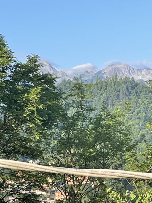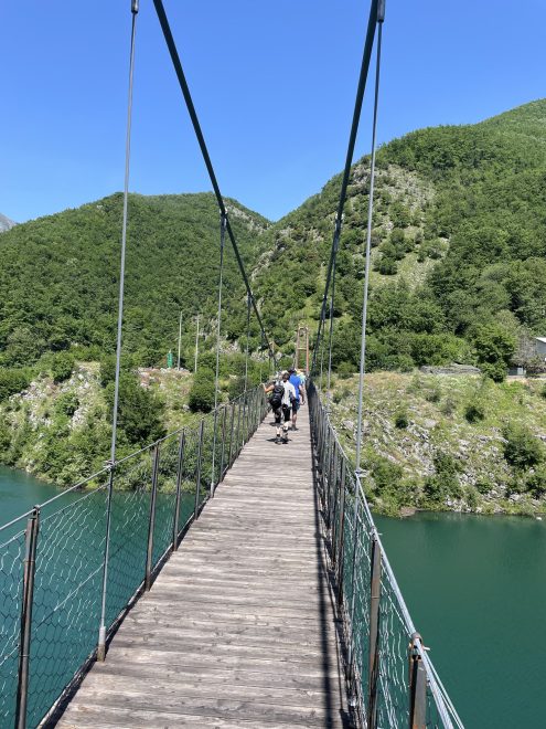 LAGO DI VAGLI in den Apuanischen Alpen. Auch hier erschraken Motorradfahrer*innen und Pkw-Lenker*innen regelmäßig, als ein unerwarteter Reisebus fleißig seine neue Hupe ausprobierte. Die Brücken über den See kamen zum Auftakt gut an, die Hängebrücke in Schaukler und Bedächtige getrennt. Die Lkws mit den großen Marmorblöcken machten Eindruck, denn der schneeweiße Marmor war i.w. mit seinem Eigengewicht gesichert. Ein Rifugio in Campocatino wurde zur Kaffeepause gerne mitgenommen.