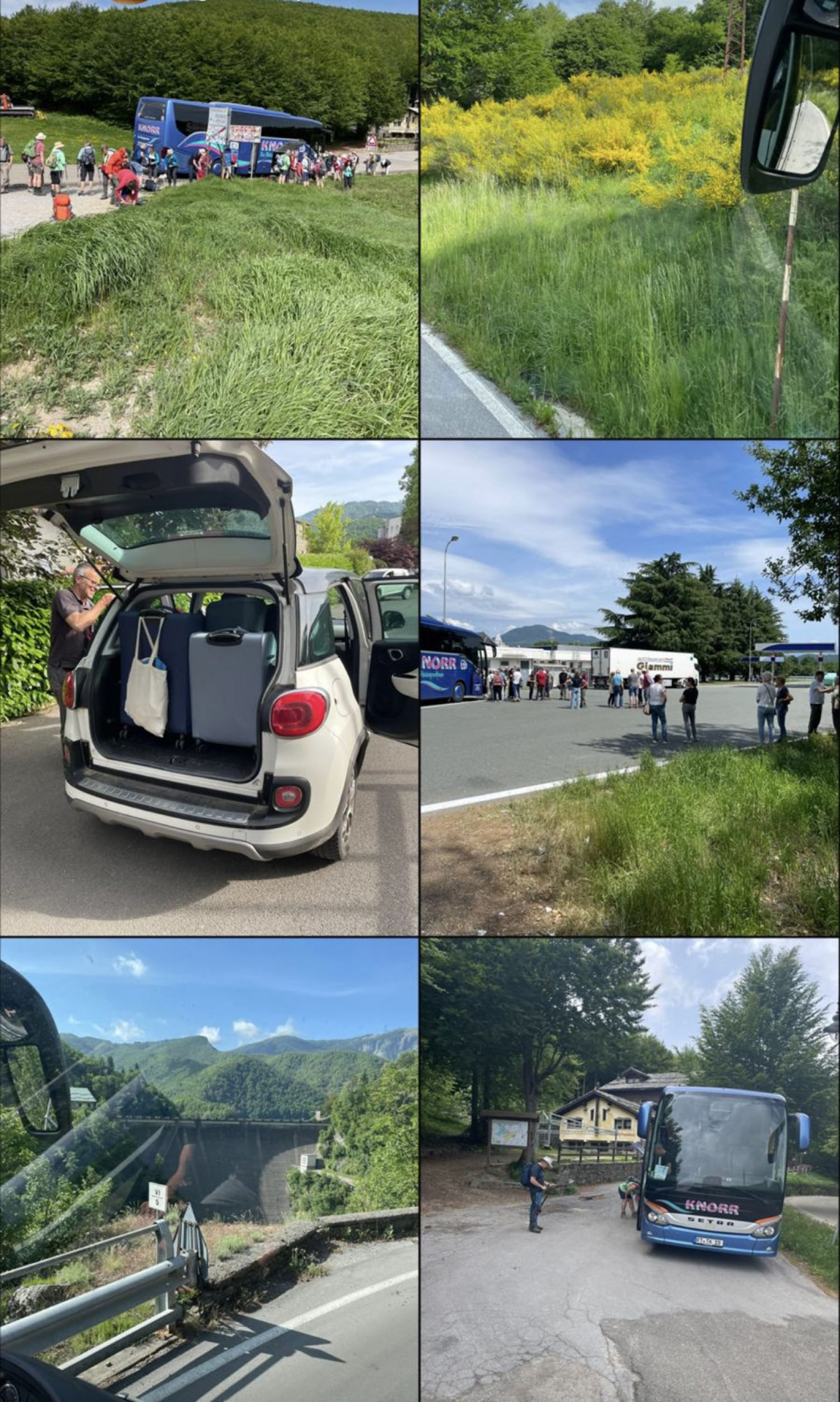 Motorradfahrer in Schräglage visieren ihren Bus an, entgegenkommende Autofahrer*innen sind keineswegs entgegenkommend, sondern fahren soweit auf dem Asphalt, bis sie doch einsehen müssen, am Bus nicht ungestreift vorbeizukommen: Richtig, es dreht sich ums gebirgige Mittelitalien. Wo sich hinter fast jeder Staats-, Regions- oder Provinzstraße ein passgenaues Gekurve verbirgt.