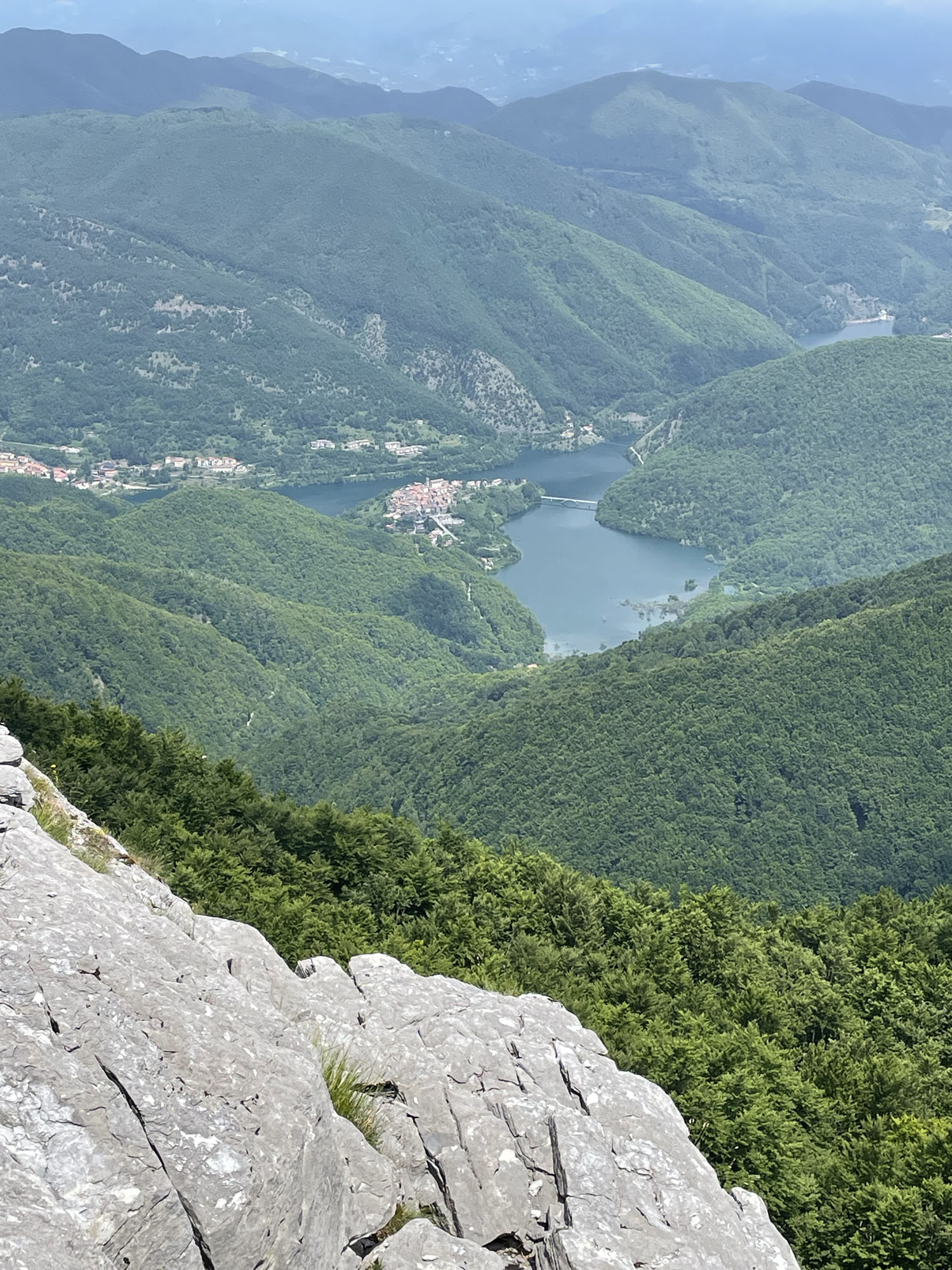 LAGO DI VAGLI in den Apuanischen Alpen. Auch hier erschraken Motorradfahrer*innen und Pkw-Lenker*innen regelmäßig, als ein unerwarteter Reisebus fleißig seine neue Hupe ausprobierte. Die Brücken über den See kamen zum Auftakt gut an, die Hängebrücke in Schaukler und Bedächtige getrennt. Die Lkws mit den großen Marmorblöcken machten Eindruck, denn der schneeweiße Marmor war i.w. mit seinem Eigengewicht gesichert. Ein Rifugio in Campocatino wurde zur Kaffeepause gerne mitgenommen.