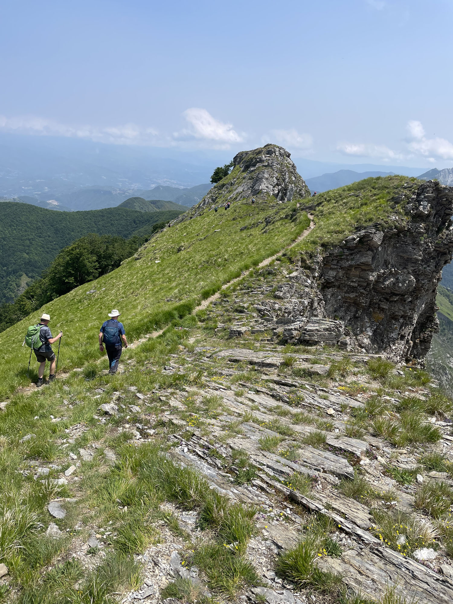 PASSO DI PRADARENA. Der Apenninwind machte Ernst, so dass eine Gruppe den Monte Cavalbianco in der anderen Richtung und zurück erstieg. Die weite Runde über den Monte Sillano und andere Gipfel mit tatsächlich 27 Teilnehmenden hatte es aufgrund der Gruppengröße in sich. Alle wieder am Pass: Haken dran.