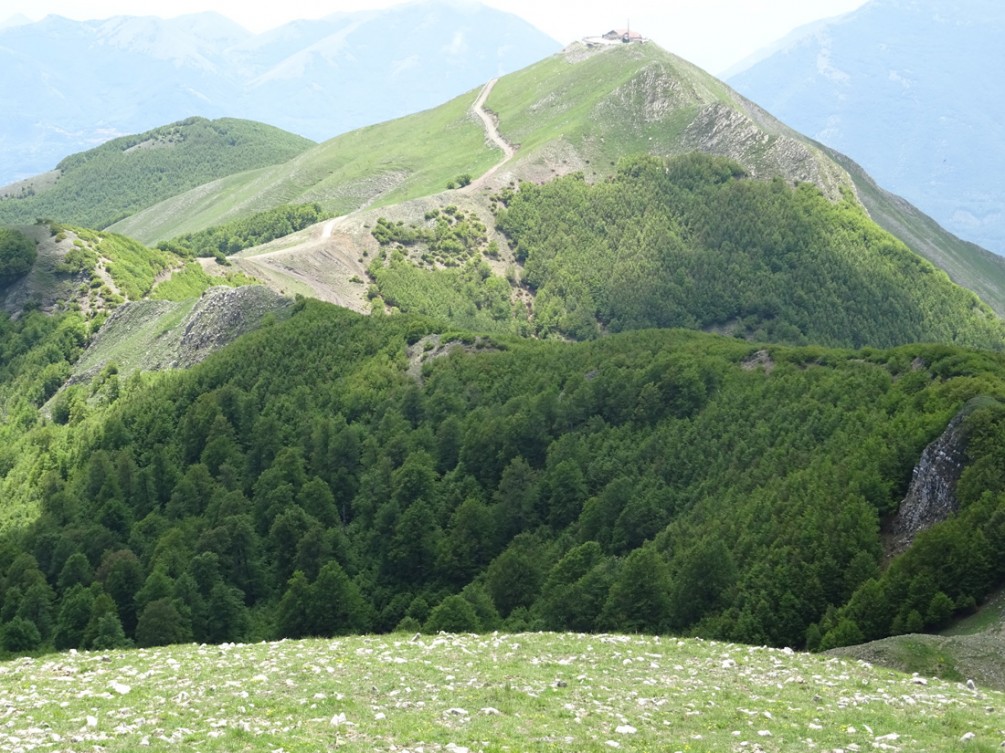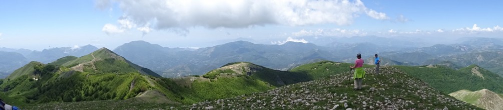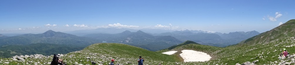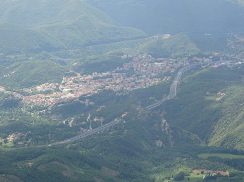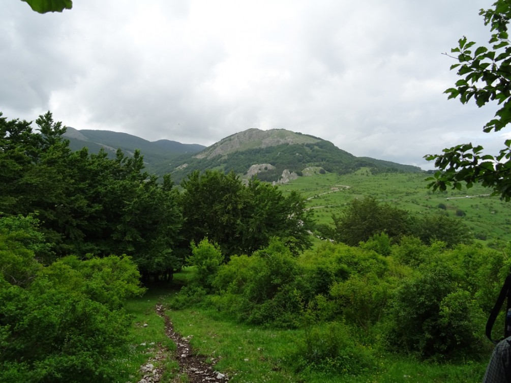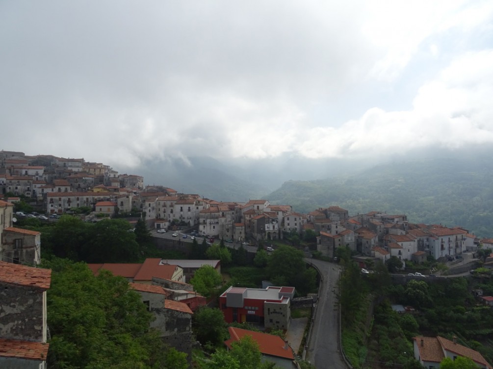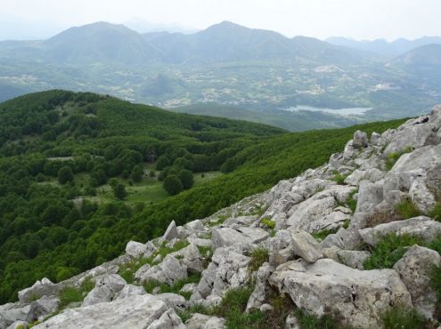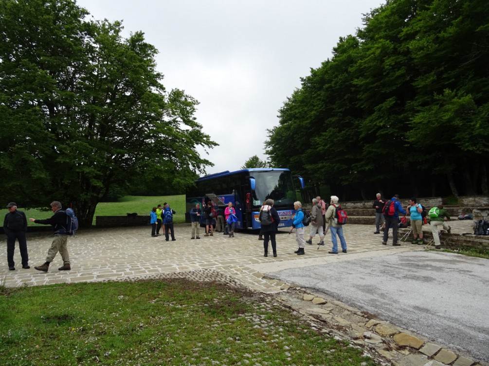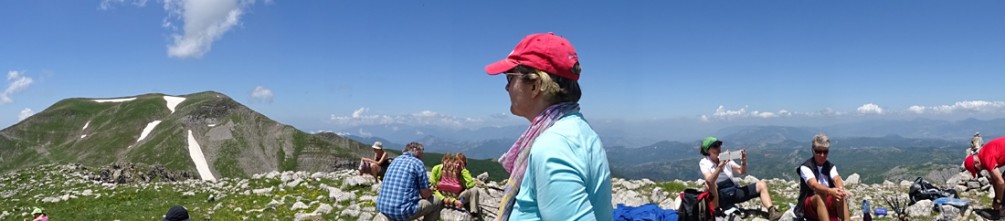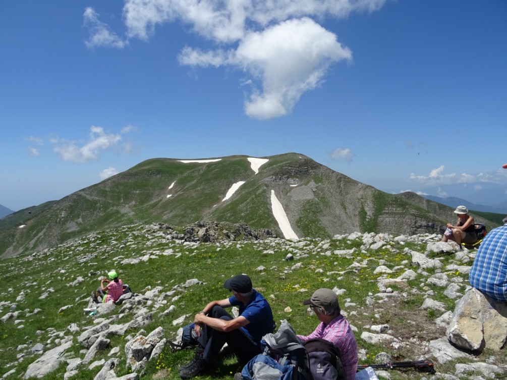 Im Sirino-Massiv stießen wir bis zu den letzten Schneefeldern auf 2.000 m des Monte del Papa (Papstberg) vor. Die Juchzer waren garantiert: „Ein Adler, ich hab noch nie einen in freier Natur gesehen!“ Schließlich waren 7 bereit, den Schienad‘Asino (Eselsrücken) genannten Grat zu überschreiten und noch eine laaange Runde dranzuhängen. Das war nicht das Schwierigste, sondern dem überhand nehmenden weißen fliegenden Etwas (keine Mücken, eher Blattläuse, weiße Fliege?) des Buchenbuschwaldes zu entfliehen…Augen zukneifen, Mund zulassen, nur vorsichtig durch die Nase atmen. Bäh! – Zuvor hatten wir mit dem großen Bus auf dem Wochenmarkt in Lagonegro für Aufsehen, aber auch für Umsatz gesorgt.Gestikulierende Italiener: „Hier geht es nicht weiter mit dem Bus.“ „Schon klar. Wir wollen ja hierher!“ „?“ Die Marktbeschicker haben sich gefreut, haben richtig aufgedreht, ihr Obst anzupreisen. – Aber: Wie kommen wir hier wieder raus Richtung Berge? Die PoliziaLocale hilft: „Ganz zurück, am Krankenhaus vorbei, wieder runter, dann ist es immer angeschrieben.“ „Aha.“ Das hat sogar geklappt, ein Navi kommt halt manchmal an seine Grenzen und trifft enge Gassen oder verbotene Einbahnstraßen an.