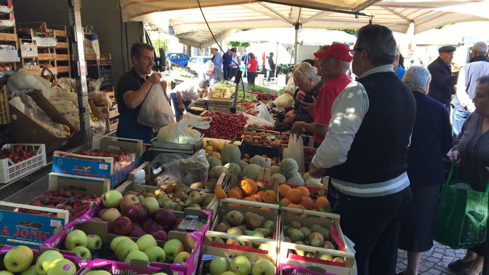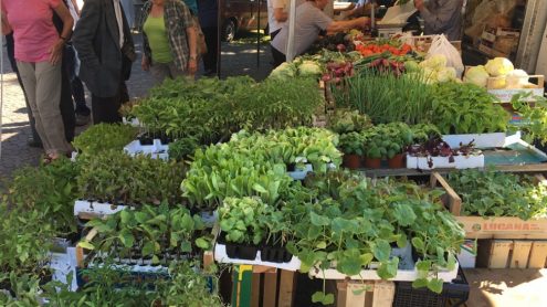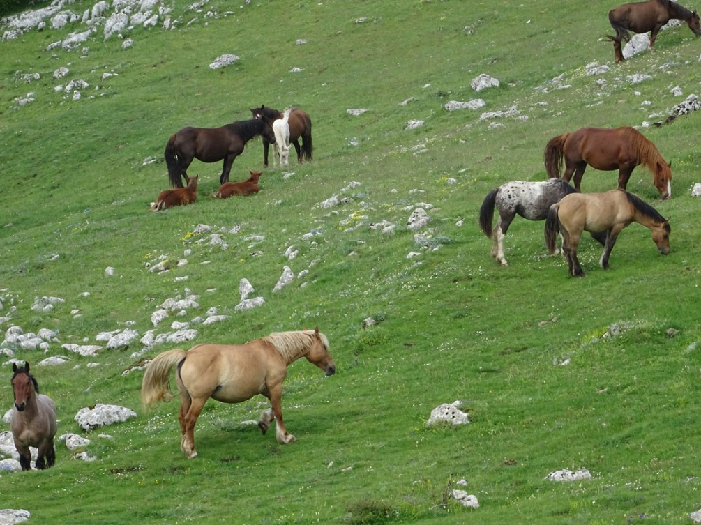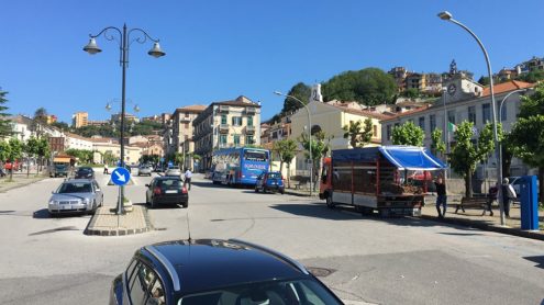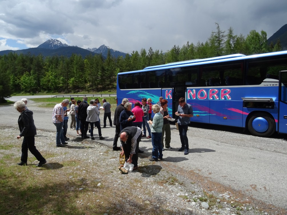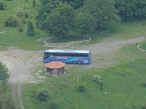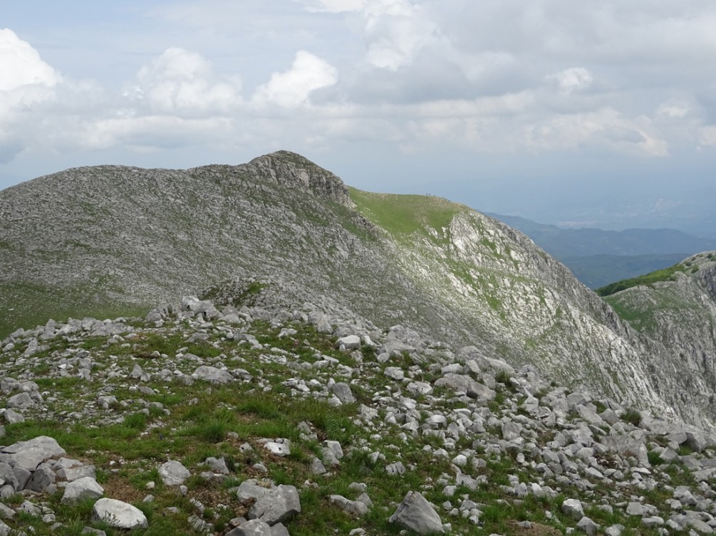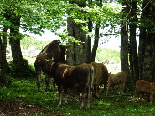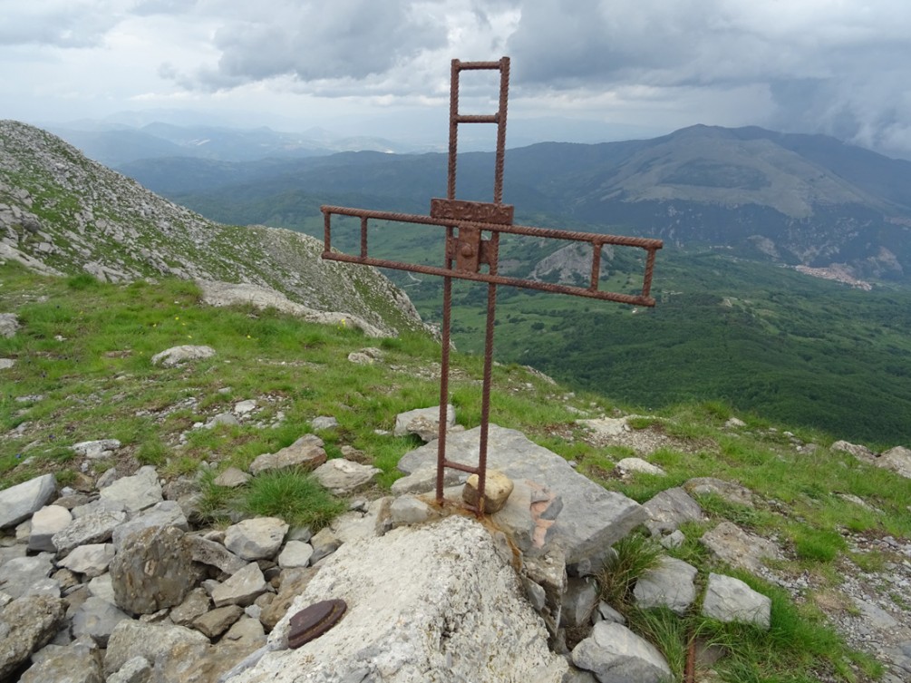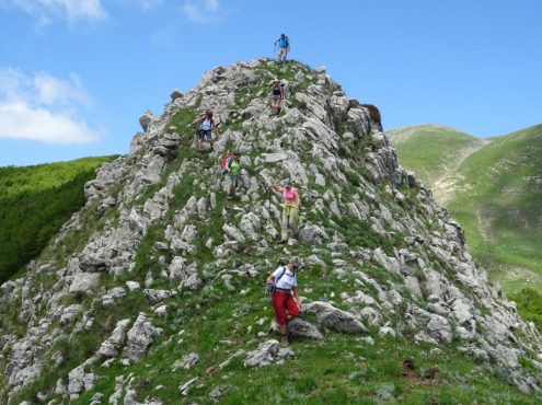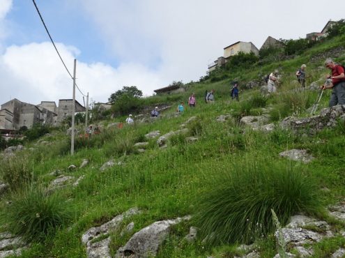 Im Sirino-Massiv stießen wir bis zu den letzten Schneefeldern auf 2.000 m des Monte del Papa (Papstberg) vor. Die Juchzer waren garantiert: „Ein Adler, ich hab noch nie einen in freier Natur gesehen!“ Schließlich waren 7 bereit, den Schienad‘Asino (Eselsrücken) genannten Grat zu überschreiten und noch eine laaange Runde dranzuhängen. Das war nicht das Schwierigste, sondern dem überhand nehmenden weißen fliegenden Etwas (keine Mücken, eher Blattläuse, weiße Fliege?) des Buchenbuschwaldes zu entfliehen…Augen zukneifen, Mund zulassen, nur vorsichtig durch die Nase atmen. Bäh! – Zuvor hatten wir mit dem großen Bus auf dem Wochenmarkt in Lagonegro für Aufsehen, aber auch für Umsatz gesorgt.Gestikulierende Italiener: „Hier geht es nicht weiter mit dem Bus.“ „Schon klar. Wir wollen ja hierher!“ „?“ Die Marktbeschicker haben sich gefreut, haben richtig aufgedreht, ihr Obst anzupreisen. – Aber: Wie kommen wir hier wieder raus Richtung Berge? Die PoliziaLocale hilft: „Ganz zurück, am Krankenhaus vorbei, wieder runter, dann ist es immer angeschrieben.“ „Aha.“ Das hat sogar geklappt, ein Navi kommt halt manchmal an seine Grenzen und trifft enge Gassen oder verbotene Einbahnstraßen an.