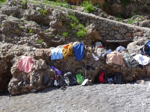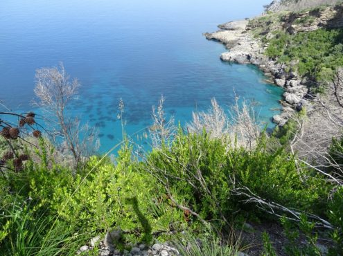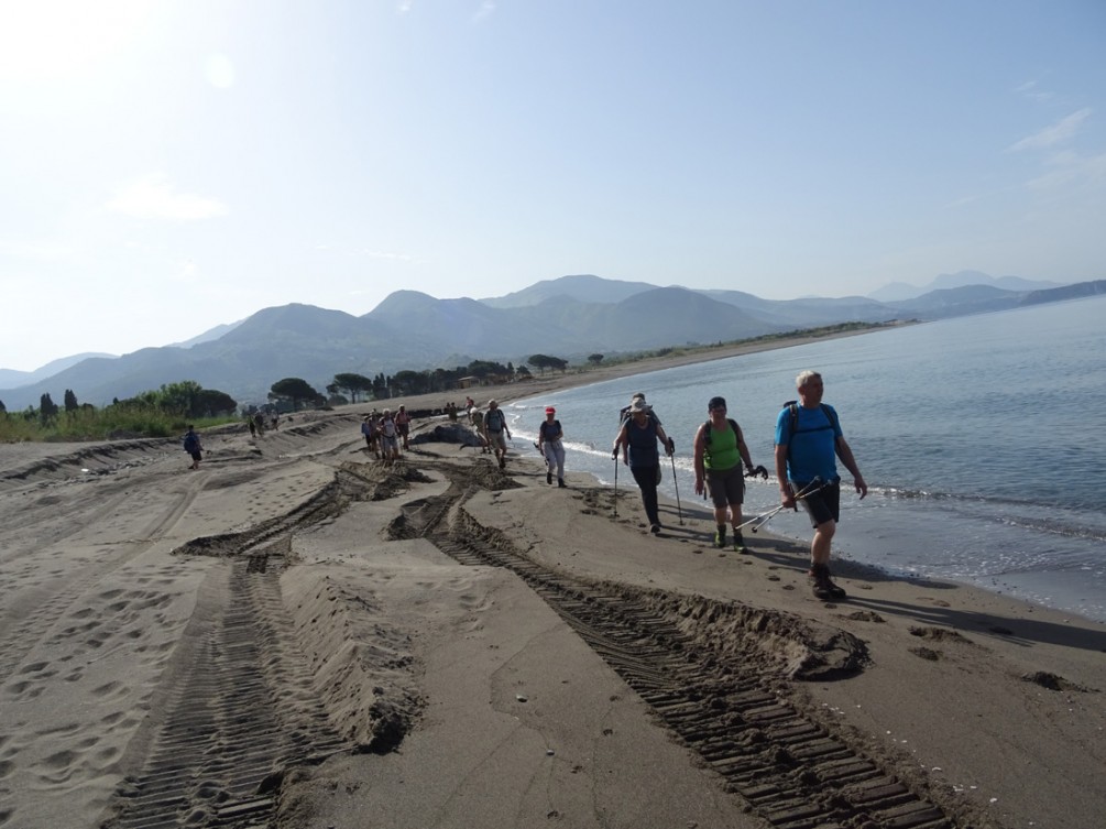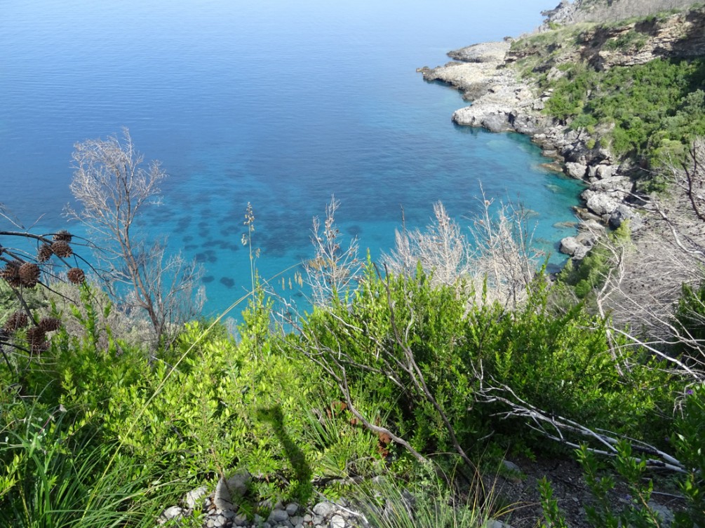 Da die italienische Region Basilikata allenfalls über Flughäfen der Nachbarregionen von Deutschland zu erreichen ist und ein Bus vor Ort immer Vorteile hat, hatten wir uns zur 1½-tägigen Anfahrt mit dem Bus entschlossen. Nach einer Nacht im Veneto erreichte die 27-köpfige Gruppe das Hotel an der tyrrhenischen Küste der Basilikata. In der äußerst gepflegten Anlage war gut sein, doch es lockte die Auftaktwanderung über den Passo Colla hinunter zu einer Traumbucht. Von 800 m auf 0 m wanderten wir auf offensichtlich kaum begangenen Pfaden. Die letzten Stufen zum Meer, ab ins Wasser. Danach ein Schnäpperles-Bier aus dem Buskühlschrank. Was will man mehr?