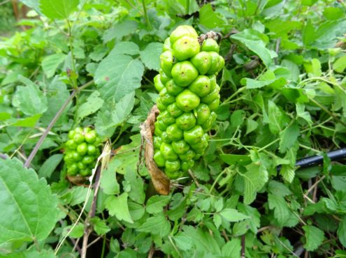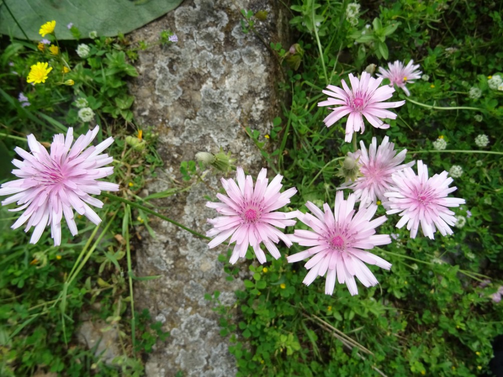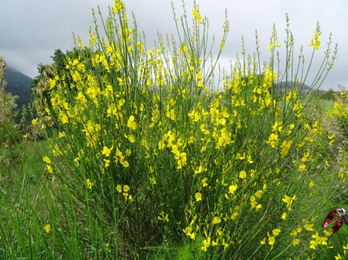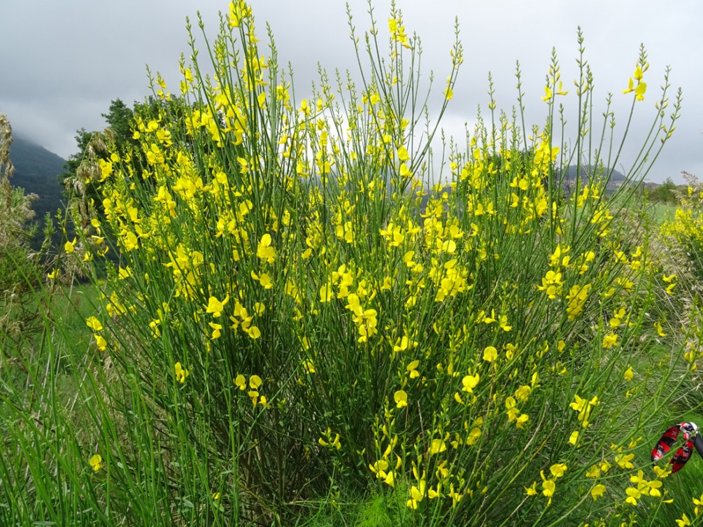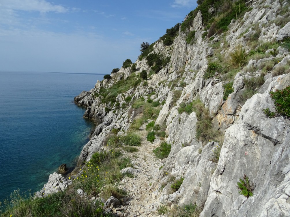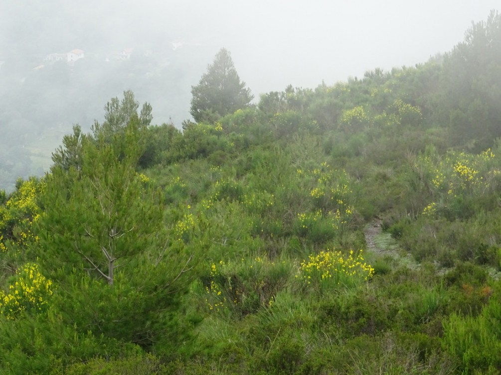 Am Meer stellte sich zunehmend drückend-schwüle Luft ein; den Wolkenschleier hofften wir am Monte Curatolo über Aieta auf einem CAI-Pfad zu durchbrechen. Pustekuchen! Wunderschönen Blumen am Wegesrand folgten immer stärker zugewachsene Wege: Ginster, kratzendeHecken, Buschwald. Es schauten nur noch unsere Köpfe heraus, als wir abermals die richtige Trasse aufgespürt zu haben glaubten. Sehr anstrengend für so wenig Sicht! Da erklärten wir die erreichte Höhe zum Mittags- und Umkehrpunkt: „Man sähe oben eh nicht mehr als hier und früher im Hotel isch au molschee.“ Keine Bar hatte offen in Aieta: Erst wieder um 16 Uhr: ? Es war aber erst 14 Uhr. Wir trafen doch noch gastfreundliche Italiener in einer kleinen Bäckerei außerhalb des Ortes. Mittels deren Kühlschrank und Caffettiera konnten wir doch noch einkehren.