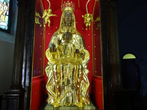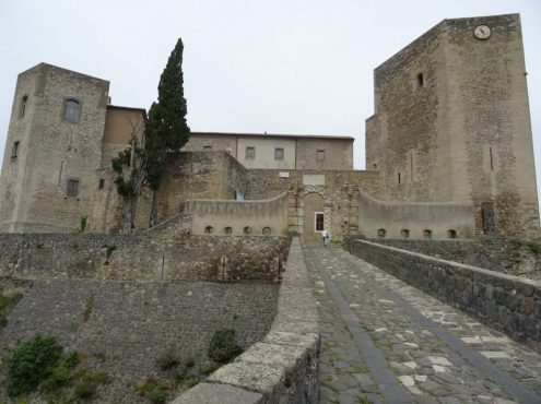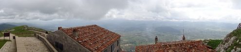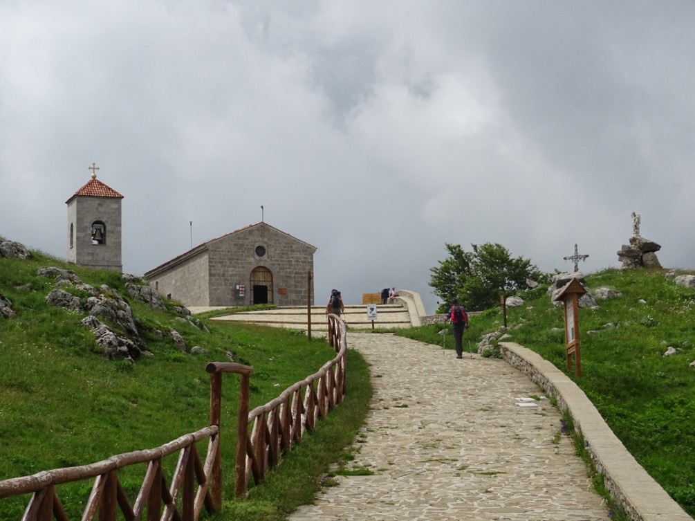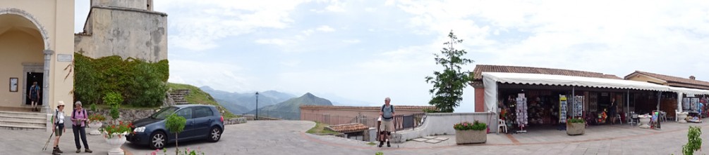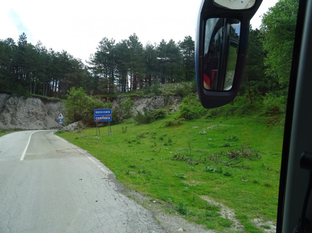 Eine Pilgerfahrt der besonderen Art unternahmen wir zum Monte Volturinound danach zur Madonna di Viggiano, beide etwa 1.800 m hoch gelegen. Anfahrt zum Tuppo delle Seti, ein Pass auf 1.300 m, auch für lukanische (Lukanien ist Synonym für Basilikata) Verhältnisse so dermaßen „hendadanna“. Pilgerfahrt Teil 1: Der Autor, wie immer der felsenfesten Überzeugung, da könne man problemlos auf 1.500 m hochfahren und auch ausreichend gut wenden (googlestreetview), musste vor den letzten Kehren doch schlucken, als plötzlich der Asphalt unterbrochen war, weil offensichtlich die Straße wegen Erdrutsches gerade wieder gerichtet wurde. Der Sand im Straßenbett schien schon verdichtet zu sein, aber oben Genannter hörte nur noch „Wenn wir hier absaufen, dann ischaber was los!“ und schon waren wir auf Sand. Er hielt aber, wahrscheinlich, weil alle im Bus die Luft angehalten hatten. Runter erfuhren wir, dass tags darauf geteert würde. Glück gehabt. Pilgerfahrt Teil 2: Der Aufstieg zum Monte Viggiano mit dem Madonnenheiligtum war wie eine kleine chinesische Mauer, die den Berg hinauf gezogen worden war: steil, rutschig, da es mal nieselte, scheinbar endlos, man sah die Kirche lange nicht. Entsprechend warf sich einer standesgemäß bei der Ankunft flach auf den Boden – ob wegen der Sünden oder ihrer Vergebung ist unbekannt. Die Madonna mit Kind war herausgeputzt in der kleinen geduckten Bergkirche. Bei schönstem Wetter durften wir danachden Berg überschreiten, mit etwas Orientierungssinn und den Pferdeherden ausweichend erreichten wir wieder den Pass Tuppo delle Seti und gleich war der Bus wieder zur Stelle.In dem Moment kam ein örtlicher Guide mit dem Auto vorbei, der sich nach unserer Tour erkundigte. Ich dachte schon, er rügt uns für unsere kreative Wegführung, es war ja nicht immer markiert. Keine Spur.„Also seid Ihr ins Grün eingetaucht!“ (sietebagnatinelverde) – Genau!