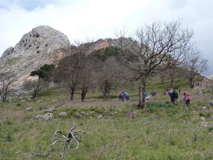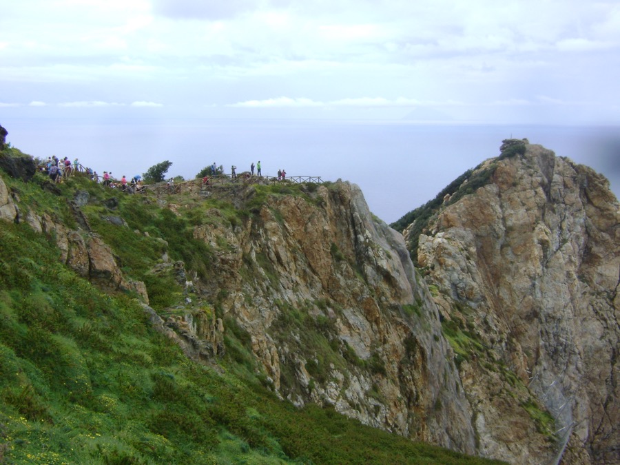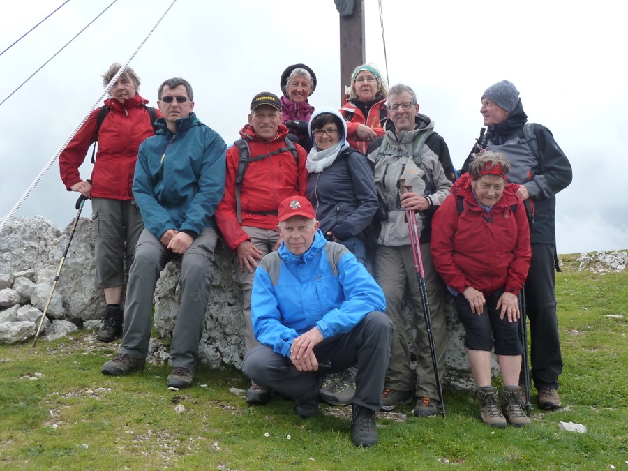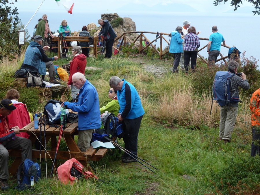 Der melodiöse Name des Berges ist schon Musik in meinen Ohren. Zaunproblem gemeistert (Danke, Franz-Josef), die abgerutschte Bergflanke mit unserem laaangen Güterzug umstiegen und unschwieriges Gelände erreicht. Wer was zwischen Pass und Gipfel machen kann, war geklärt, da peitschen Wind und Regen plötzlich unter dem Gipfelaufbau los. Gewitter? Unverantwortlich. Sieht nach Abbruch aus, wir warten mal. Leichte Enttäuschung bei einigen. Wir suchen an den Felsen Schutz. Schon steigt Franz-Josef vorbei. „Koi Problem!“ …Wurde es schon wieder heller?… Jedenfalls kein Regen mehr. Also los. Aber ein ungeheurer Wind. Das war das schnellste Gipfelfoto seit langem, es waren zum Klick fast noch nicht alle 12 (Christine, Franz-Josef, Helmut, Irene, Irmtraut, Johanna, Jürgen, Konrad, Manfred (2), Margot, Rudolf) oben auf dem Matterhorn Siziliens. Auf dem Eckpfeiler der Monti Peloritani auf nur 1370 m war es ordentlich kalt. Die unter Regencapes Wartenden wurden zügig erlöst, ein wunderschöner Höhenweg – ein bunter Albvereinszug von Capes, Überzügen, Jacken und Schirmen – führte zur Staatsstraße, wo uns Pippo schon erwartete.