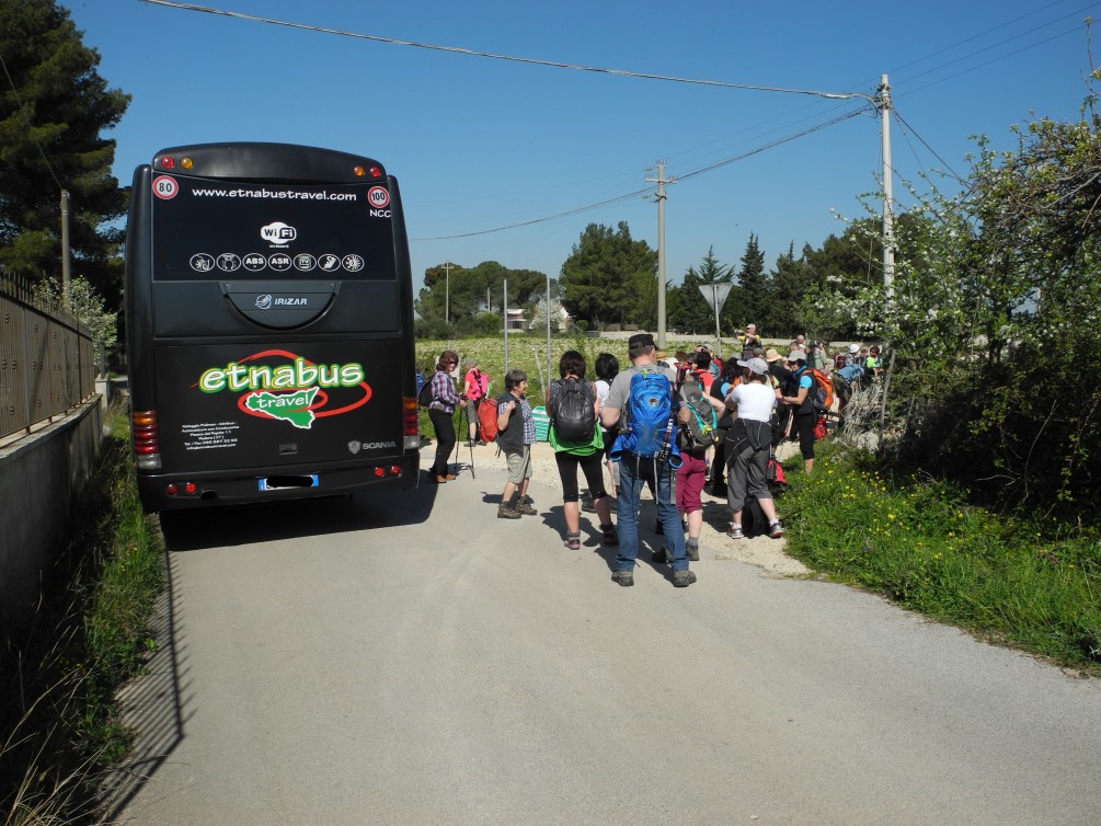 In unserer Angebotsabfrage Bus war die Durchfahrt von Sortino vorgesehen, aber aufgrund der Engstellen und knappen Ecken hatten wir das verworfen. Dann eben ein anderer Wanderstartpunkt. Pippo machte aber genau den Vorschlag, zu dem ursprünglichen Punkt und eben durch Sortino zu fahren. Das sei kein Problem, da sei er mit Schulklassen schon öfters gewesen. Also volles Vertrauen! Bei der Durchfahrt murmelte er etwas von „piazza“ und „girare“ (umdrehen), ob es recht sei. Ich hatte es nicht ganz kapiert und gesagt, er sei der Bus-Chef und es sei schon recht (va bene…). Jedenfalls bogen wir am Ende einer Gasse an einer engen Rechtsecke (Einbahn-Gegenrichtung; ging also eh nicht…) erst mal halb links in einen Platz ein und dann rückwärts auf Sicht in die enge Einbahnstraße gefühlte 200 m weit. Autos warteten und keiner hupte! Unser „Etnabus“ bewegte sich danach unter „Applausi“ unbehelligt wieder vorwärts in breitere Gefilde aus dem Ort hinaus. Und: Wo hätten sie auch eine Umgehungsstraße bauen sollen?