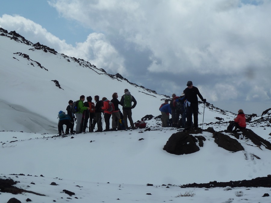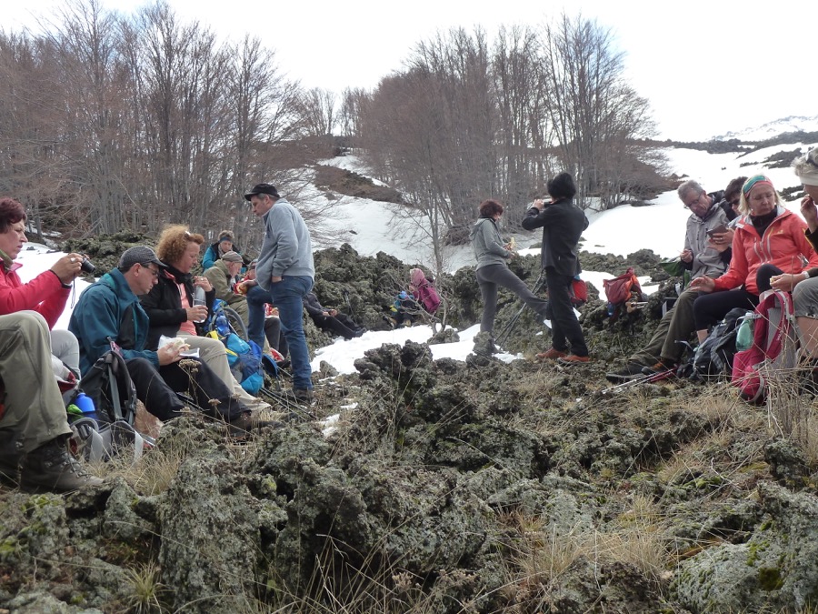 Respektable 21 Wanderer für die lange Wanderung am Ätna, startend bei 1140 m. Markierungen, Stöcke und Lavamännchen wiesen uns den Weg. Das geht so: Wer sieht das nächste Zeichen, immer den Wortlaut der Wanderbeschreibung präsent und wie hoch sind wir überhaupt schon. Über 1600 m hatten wir es an der Ätna-Nordwestseite über Stunden mit Schnee zu tun. „Gleich machen wir Pause…nur noch…“ „Wir brauchen Pauuuuuseee!“ Also raus aus dem Buchenwald auf eine Lavainsel über’m Schnee. Mit frischen Kräften, aber nässer werdenden Schuhen kamen wir mühsam immer höher. Bloß nicht am Ziel vorbeilaufen… Am Ziel, der Grotta del Gelo auf 2033 m, war durch den Schnee ein Einstieg selbst mit den Steighilfen unmöglich. Das Wetter hielt, damit waren wir zufrieden. Unerwartetes Gruppenbild in Winterlandschaft auf Sizilien. Danielas Gruppe kam auch in den Schnee hinein und durfte im Rifugio Santa Maria das Kaminfeuer nochmal auflodern lassen. Über Stunden trafen beide Gruppen keine anderen Wanderer, so einsam war es in der stricklava-bizarren, andererseits auch lieblichen Busch- und Graslandschaft.
