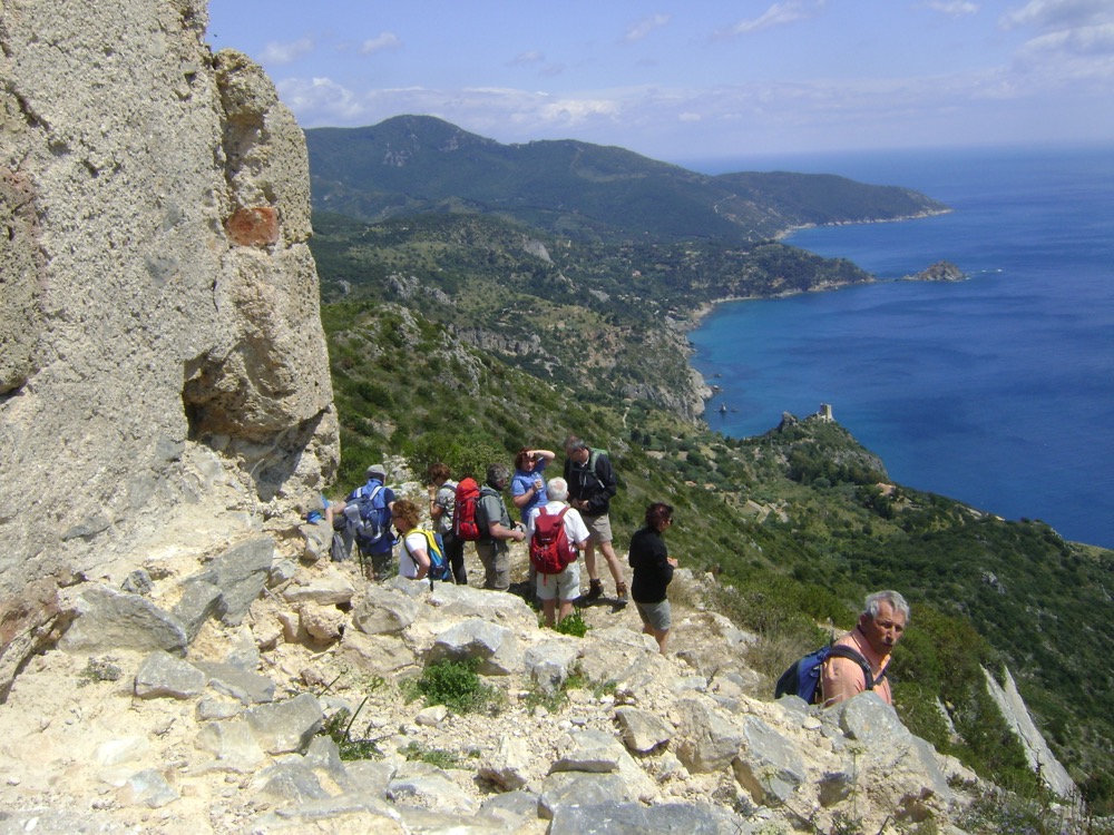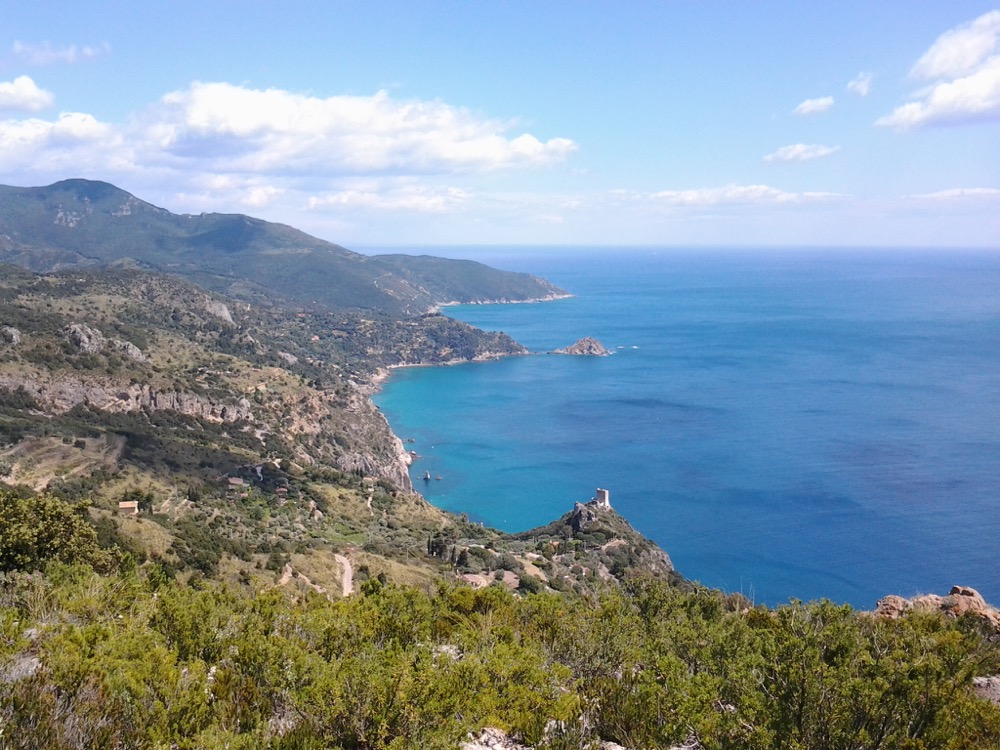 Monte Argentario im tyrrhenischen Archipel: Ein Tag nur mit Sonne und schon wird’s heiß. Torre di Capo d’Uomo, der hat sich gelohnt, Tiefblicke ins blaue Meer und Fernblicke von Pianosa über Giglio und Montechristo bis Elba. Aber weit war’s und an dem Tag eher zu wenig Wasser (aus den Flaschen).