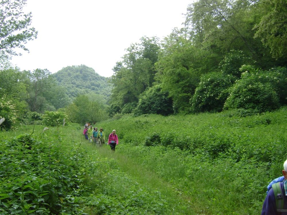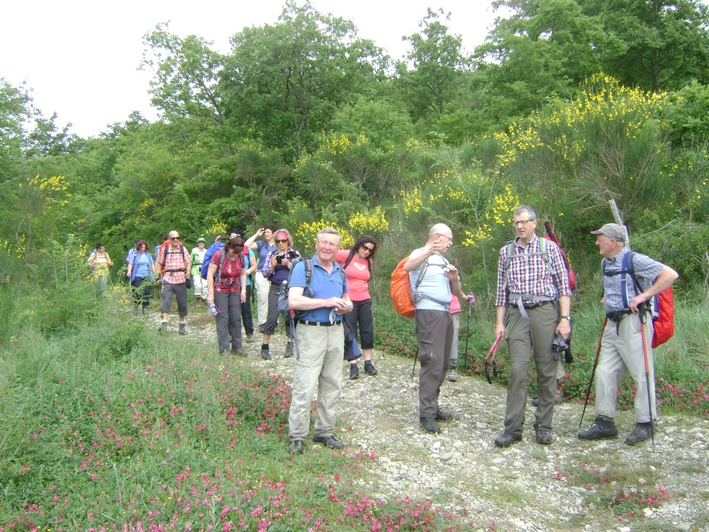 Der Gruppe voraus auf der Suche nach Pfad und schließlich Bus. So konnte ich eine (zum Glück) wegrennende Bache mit ihren auf und ab springenden Frischlingen sehen. Für ein Beweisfoto war ich zu langsam, so konnte ich meine frohlockenden Beobachtungen meinen Schäfchen – sagen wir mal – nicht überzeugend darstellen. Ganz woanders im Wald hatten alle Gruppenmitglieder ein tiefes bedrohliches Grunzen gehört, als endlich die letzten Gespräche im Zaum gehalten werden konnten. Wildschweinspuren waren allgegenwärtig, der ganze Waldboden umgepflügt. „Divieto di caccia“ (Jagen verboten) im Riserva Naturale Monte Penna. Andernorts war Wildschweinjagd nur donnerstags, samstags und sonntags gestattet. Die Tiere sind ja sehr gescheit, am Wochenende besuchen sie deswegen entfernte Verwandte am Monte Penna. Karl-Heinz, drum gab’s auch kein Wildschwein zum Essen.
