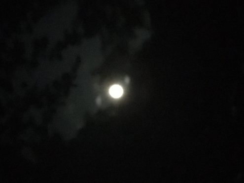 „Schweine gehabt“ kurz vor Unterwilzingen: So leise waren wir offensichtlich unterwegs, dass nahe vor uns eine Rotte Wildschweine polternd in den Wald flüchtete. Inzwischen beleuchtete der Mond diese nördliche Talseite.