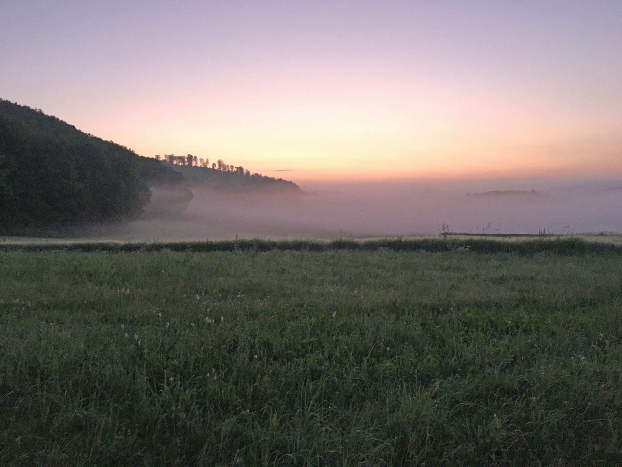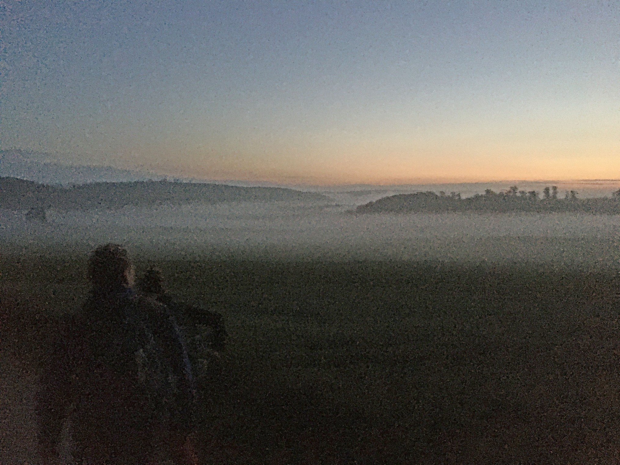 Durch das viele Wasser plätscherte die Lauter recht munter. Wir verließen sie bei Unterwilzingen. Auf der Höhe Richtung Oberwilzingen leuchtete der Mond prächtig die einsame Nacht aus. Es dämmerte, die Nebelschwaden in den Tälern und Senken boten im Morgenlicht spektakuläre Motive. Vom Wilzinger Berg aus lag Hayingen hinterm Nebel. Kurz vor 6 Uhr liefen wir nach gut 16 km ins erwachende Städtle ein.